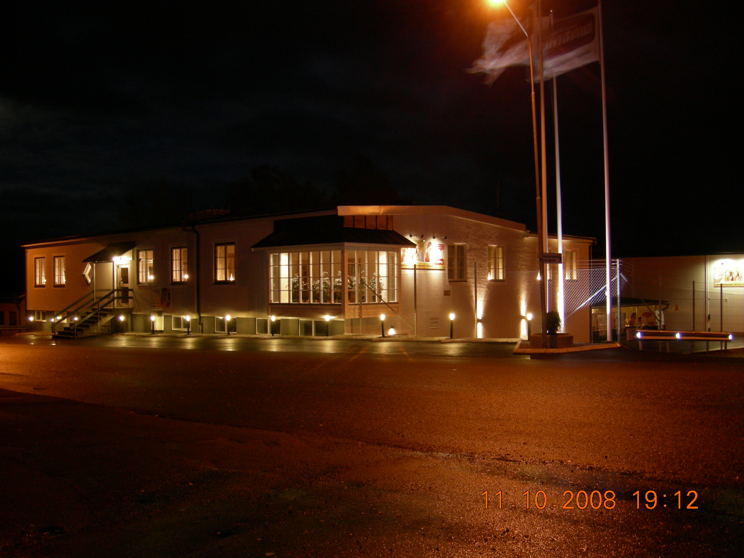 I slutet av vecka 41(-08) lämnade snickare, målare och elektriker vårt bygge på företaget , allt var färdigt. Det är 16 månader sedan grävskopan kom och började gräva. Det har varit en otroligt intensiv tid att leda företaget och att leda bygget. Under 2 veckor för ett år sedan hade vi bara en pressening till tak över vissa delar av kontoret. Nu lyser det nästan som en julgran på Stigbergsvägen. Alla lampor ute och inne får en signal från Europa uret i Frankfurt. En mer proffsigt tagen bild finns på torebrings.se och under Företaget. Jag ville ta en bild i höstmörkret och med alla lampor tända. Huset är en gammal snickerifabrik sedan 1948 som vi byggt om och byggt till i olika omgångar. Nu är vi färdiga och är stolta över resultatet.