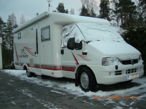 Här står den vår trotjänare och väntar på oss och att vi skall få tid att åka. Vinterdäcken ligger på, 6 – 7 grader på insidan, snökedjor och snöskyffel i bagaget. För att klara vintern bättre har den i år fått en Ditec lackbehandling.