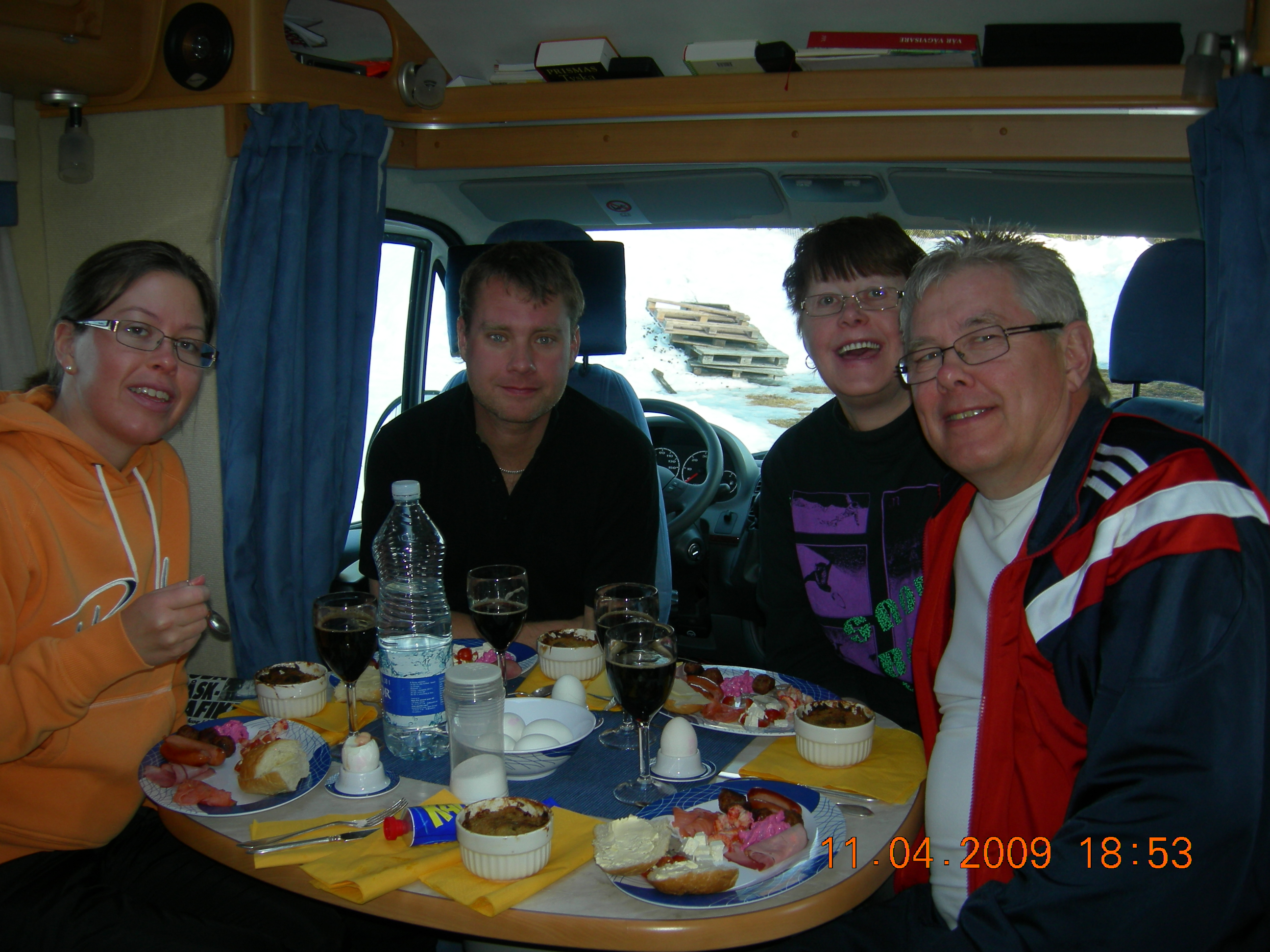 Först långfredag med regn, sedan påskaftonen med strålande solsken, ett åk i Väggen och flera åk i alla de andra svarta backarna i Hundfjället. Vad kunde sedan smaka bättre en Birgittas påskbuffé, med ägg, sill, lax, Janssons frestelse bakade i suffléformar av våran måg, Mabbe, köttbullar, prinskorv och flera goda sallader. Att berätta allt detta trevliga fick vänta tills vi kom hem. Jag som nästan vaknar och somnar med datorn i knät, men på Grundforsens Camping i Stöten tog det 4-5 timmar att lägga ut en enda bild med mitt Tele 2 modem. Inte en TV kanal gick att se på. Vår dotter och måg kom ut med sina modem och vi kunde se något TV program på webben. Visst är det skönt med tystnaden ibland.