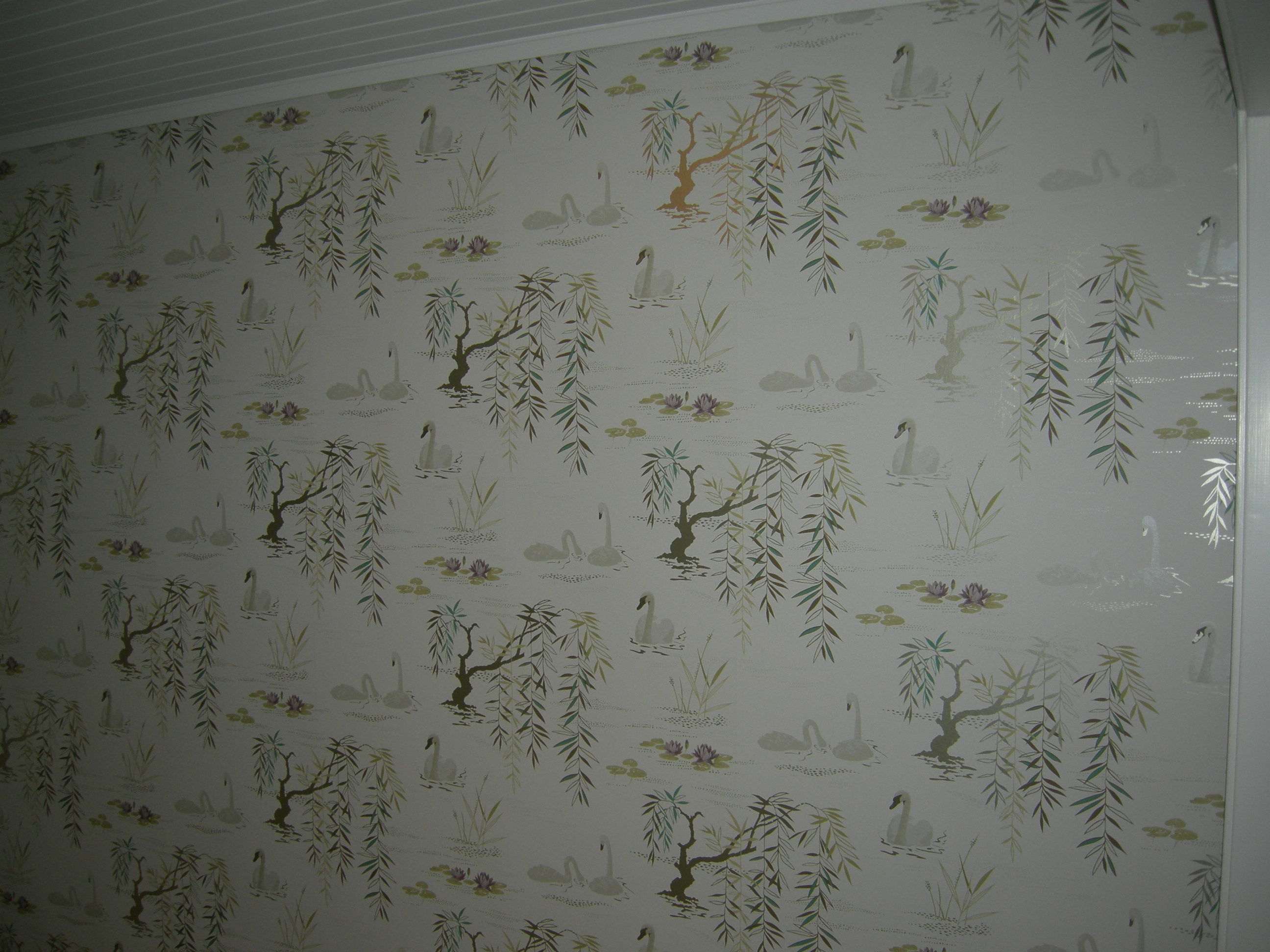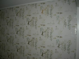 Inne har vi Extreme home make over och god hjälp av grabbana på Jarls Måleri. Vi har 2 stolar kvar att sitta på på hela övervåningen och var sin säng att sova i. I Bottenvåningen har vi en liten bit av soffan kvar. Den blev mindre och mindre i takt med reklamen på TV. Det är drygt 10 år sedan det begav sig senast och därför blir jobbet ganska stort och kommer att ta 4 veckor innan vi är klara. När vi har dammsugt marknaden på tapeter på nätet och i butik har jag förälskat mig i Nina Campell. Ovan en fondvägg med ”Fåglar på tapeten”.
