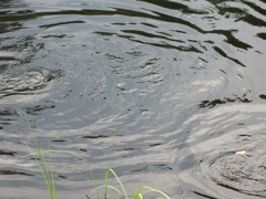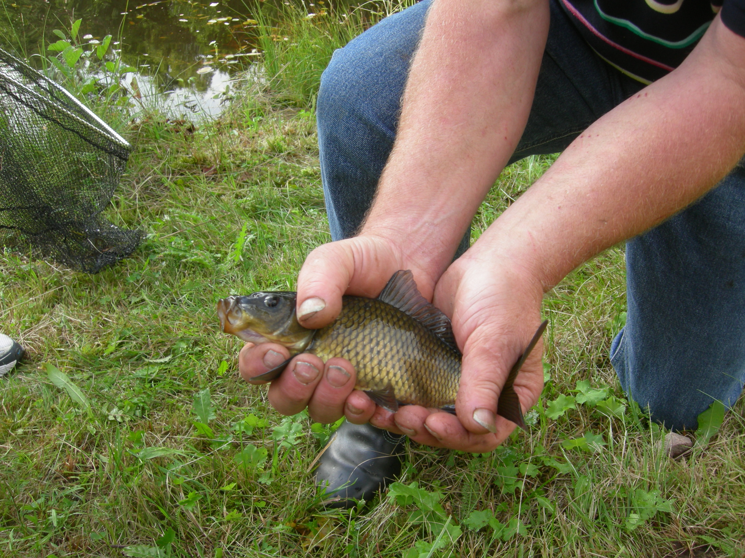 Hela dammen ”kokar” av fisk. Vårt värdpar Christer & Anita står här ofta om kvällarna och matar fisken, Silverkarp, med gammalt bröd . Självklart har de planterat in fisken i dammen.