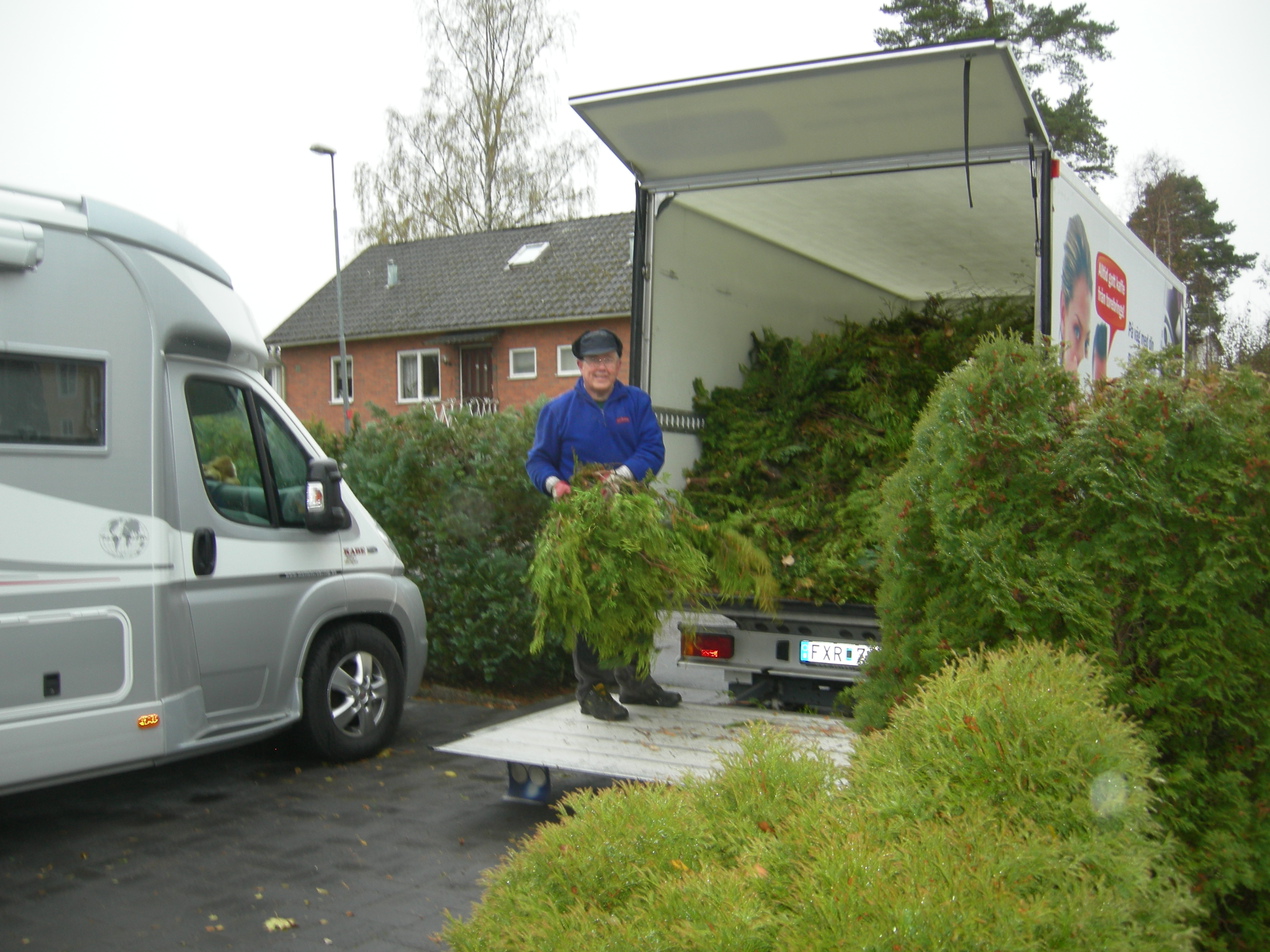 Förra helgen skrev jag, en hemmahelg till, så är jag klar ute och så blev det. Snön höll på att lägga hinder i vägen för sista löven. Jag var ute och började innan det ljusnade, för nu gällde det att bli klar. Ett stilla regn hela dagen gjorde att snön smälte och jag fick bort löven. Jag har toppat ned mina Thujor och Idegranar med c:a en halv meter och det blev fullt lass till Kretsloppet. Till sist, efter att bytt kläder flera gånger, på grund av regnet, fick jag ned några påsar lökar. Nu lägger jag på vinterdäcken i veckan på Kaben, för nu måste vi ut igen.