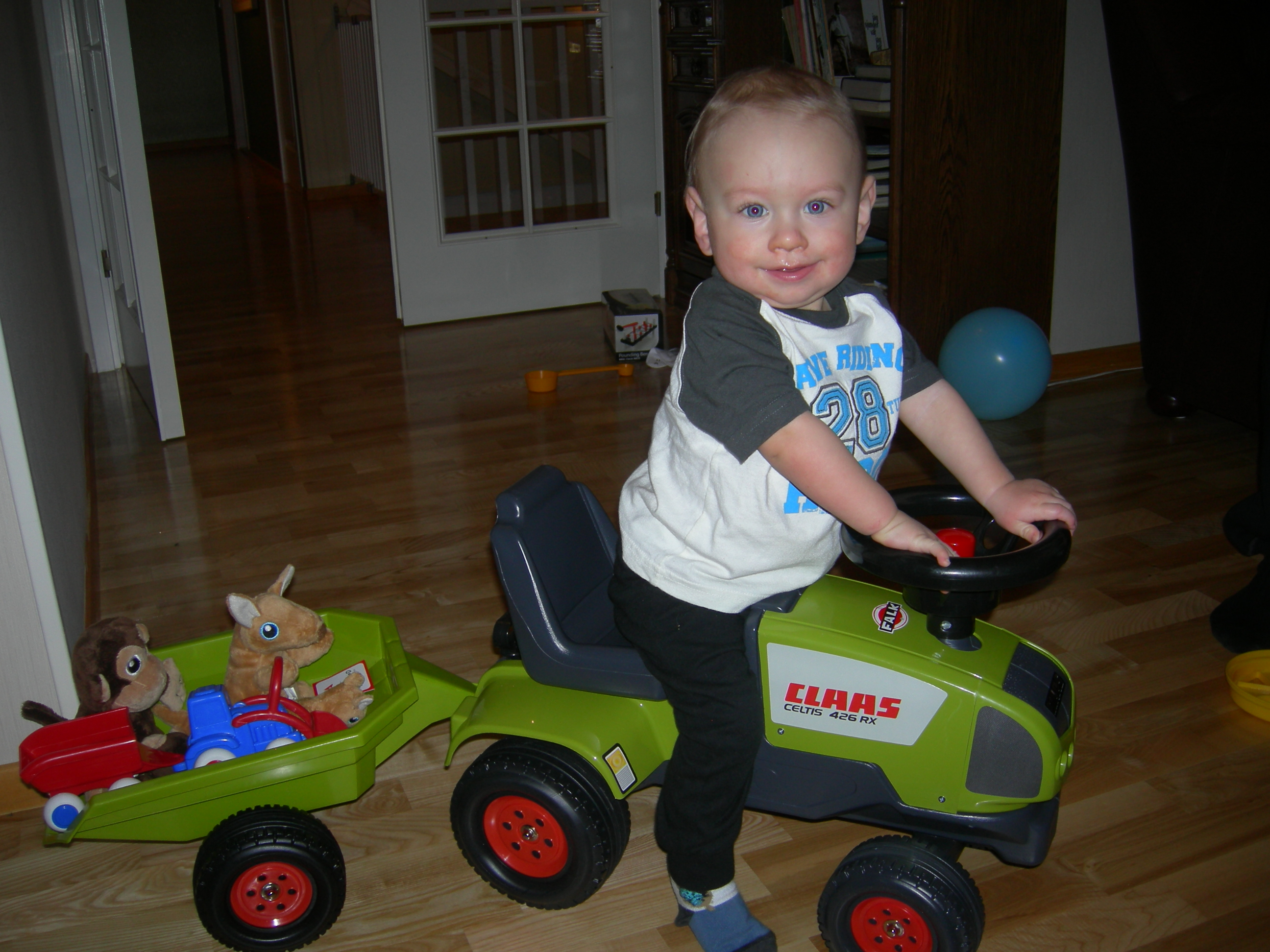 Redan ett år har gått sedan Oliver, vårt 2:a barnbarn, kom hastigt till världen, en månad för tidigt. Nu hade han bjudit hela släkten och med pappa Mikaels hjälp lagat mat och bakat tårta. Festen blev hemma hos oss och roligast för mig och oss alla var att Birgitta kom hem från lasarettet en timma före festen. När jag blir stor, har Oliver redan sagt, då ska jag bli som morfar. Då måste du tidigt lära dig köra traktor, sa morfar och överlämnade denna Claas traktor med påhängskärra.