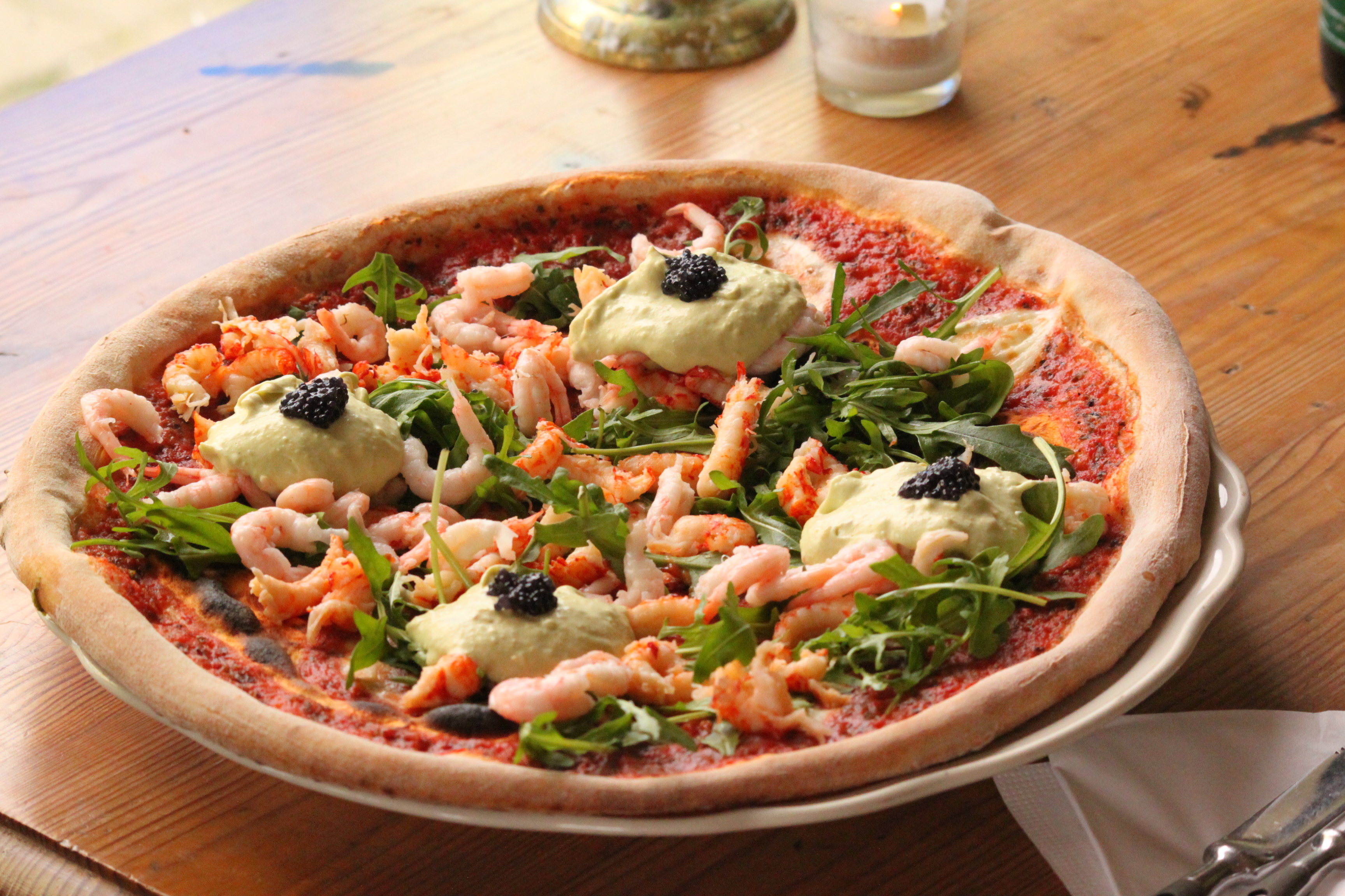 Gissa om den var god… pizzabotten var så lövtunn som när man bryter sönder ett torrt löv och dessutom bara handpillade räkor, underbart gott!