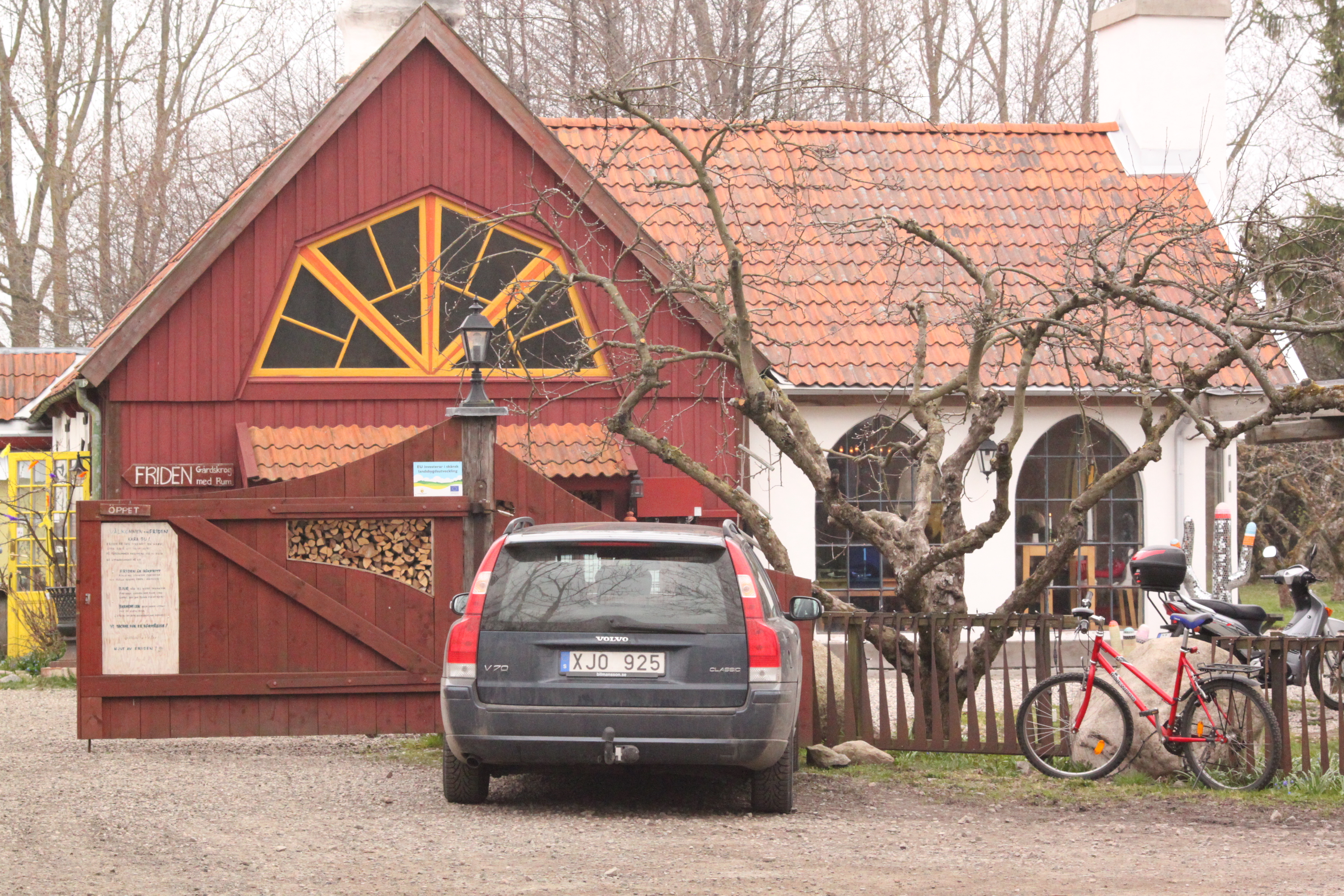 Med på resan var vår nya Honda. Vi har aldrig provat innan att åka 2 på den. Nu med smala enkelriktade gator kändes det som gjort för premiärtur med Birgitta där bak. Först kändes det lite obekvämt, jag blir genomsvett, sa Birgitta. Efter en liten sväng i Kivik, körde vi ut till Mellby, där Friden ligger, c:a 4 km bort. I em åker vi tillbaka dit på Hondan. Det sägs att sommartid måste man boka bord 4 veckor före. Det ska bli spännande. Vi vet nu att det ligger på en lantgård vid vägens ända.