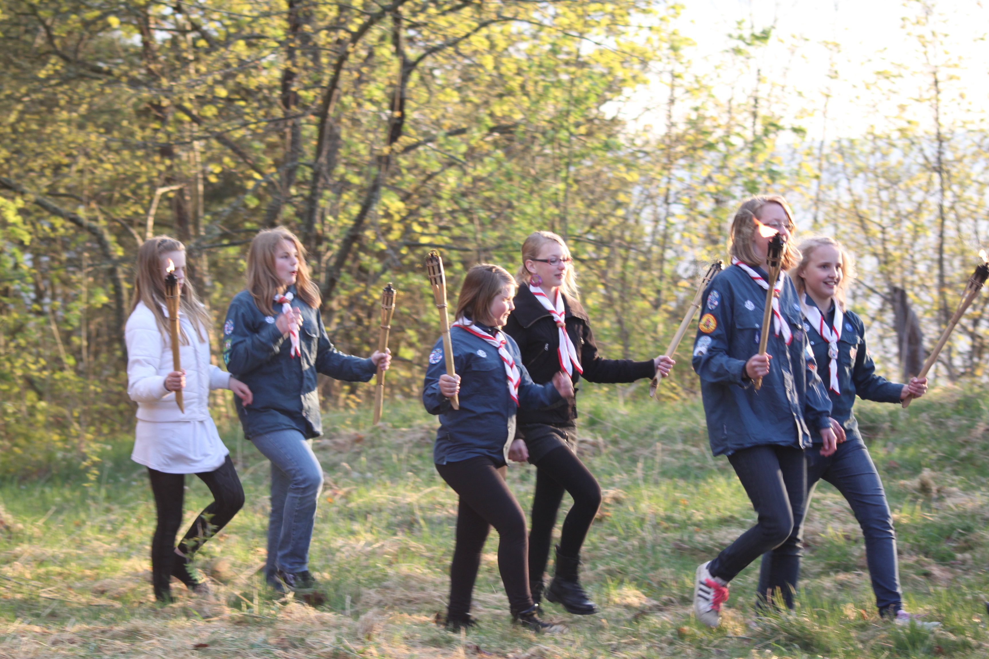 Hemkomna från Visingsö på em ställde vi Hondan ute för att fara till Grännaberget på kvällen. Vi grillade ute, men fick äta inne, det började blåsa jättemycket och dessutom regna. När klockan var halvåtta startade vi Hondan och drog iväg i småregnet. Plus 7 grader ute och riktigt kallt efter sommarvärmen. Här kommer scoutkåren med facklor för att tända brasan.