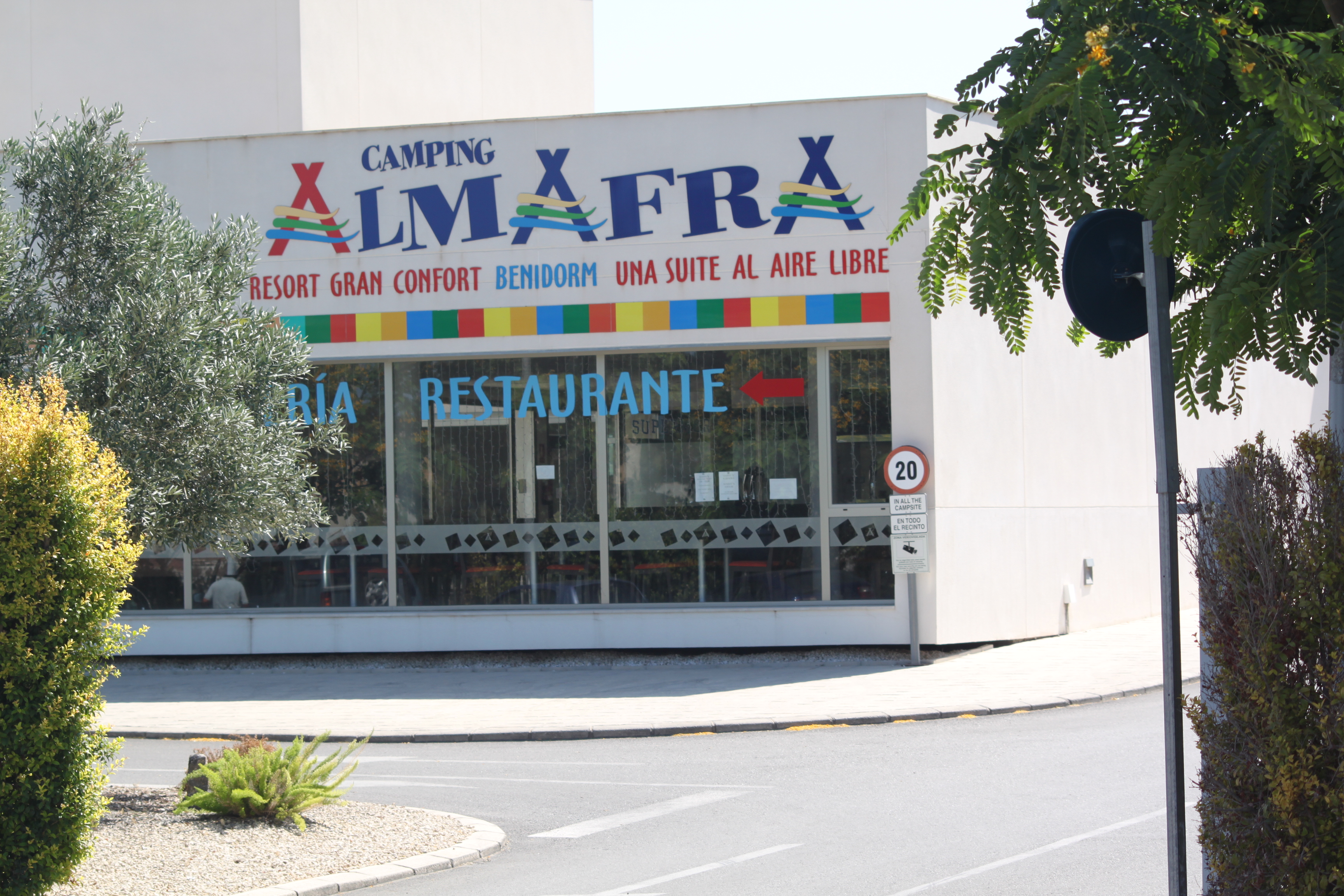 Idag, den andra dagen på Camping Almafra, Benidorm, några mil norr om Alicante Spanien, har vi gått de två km upp till stan och handlat. Miljön, människorna, grönskan och allt det vackra. Det känns verkligen långt bort till hemma just nu. Här ligger entrén till campingen.
