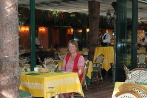Här väntar Birgitta på vår beställning. Vi var nog först med att beställa in mat denna söndagskväll.