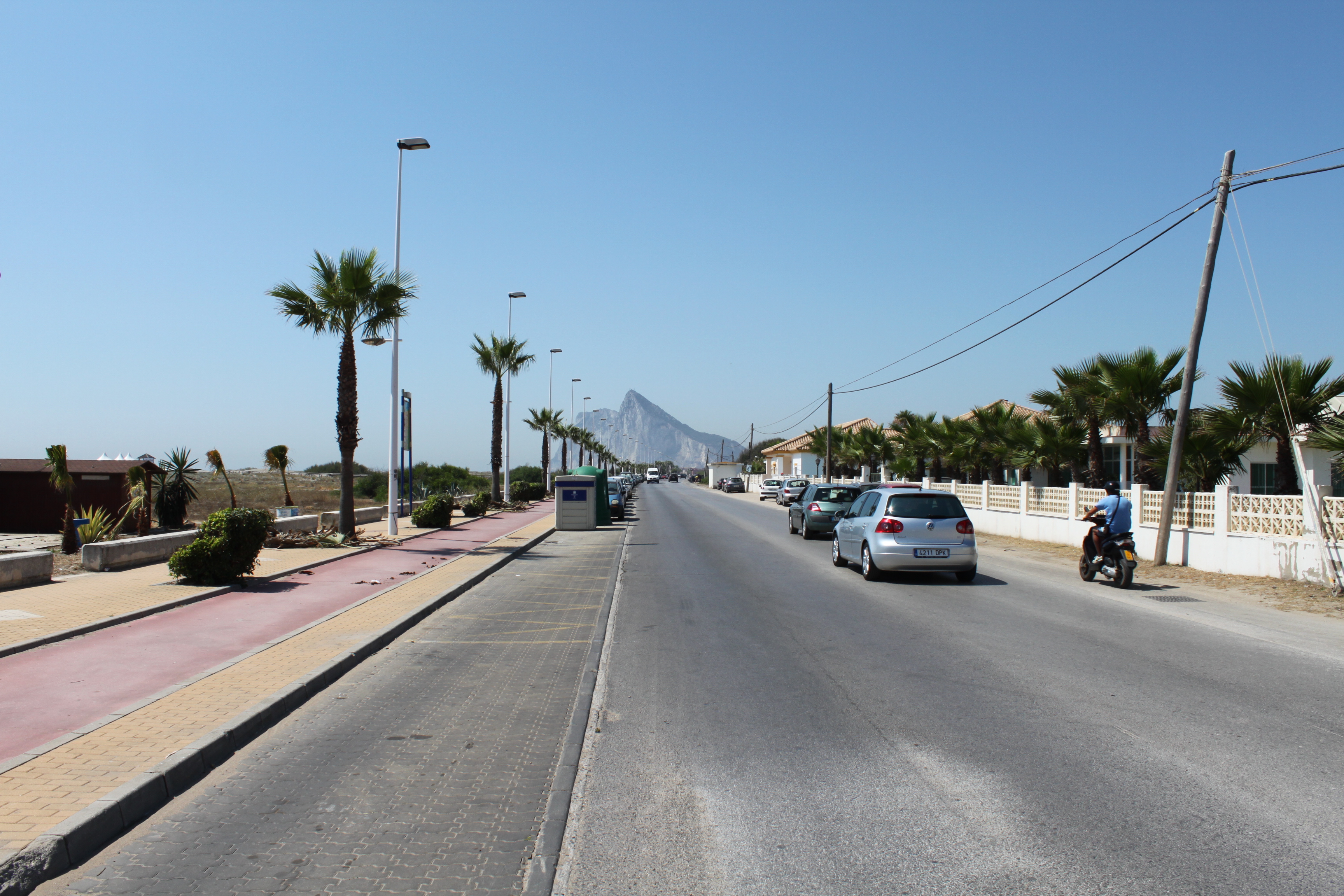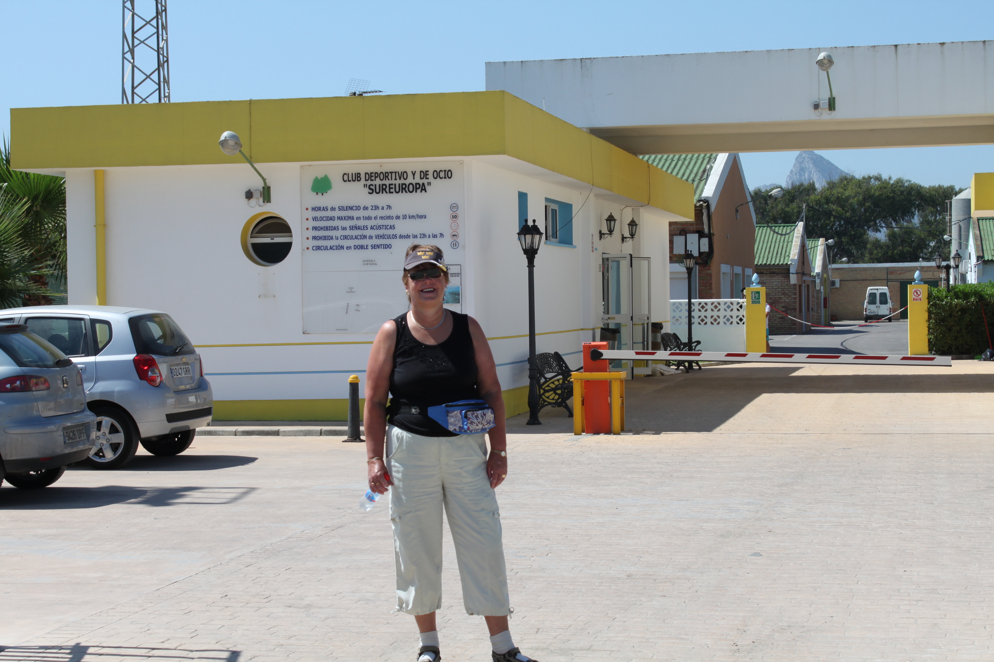 Här bakom muren och husen ligger vår camping. Ett hundra meter till vänster har vi Medelhavet. Det första vi märkte var att engelska det existerar inte här. Vid incheckningen var han tvungen att plocka upp en bild på en hund för att fråga om vi hade hund med oss. Jag ”frågade” hur långt det var kvar till Gibraltar och fick en karta, som såg busenkel ut,” Ten minutes” to go, trodde vi han menade. Det var ju bara några korsningar så var vi där, ”enligt kartan”. Vi började gå, klockan var ju bara runt tio….