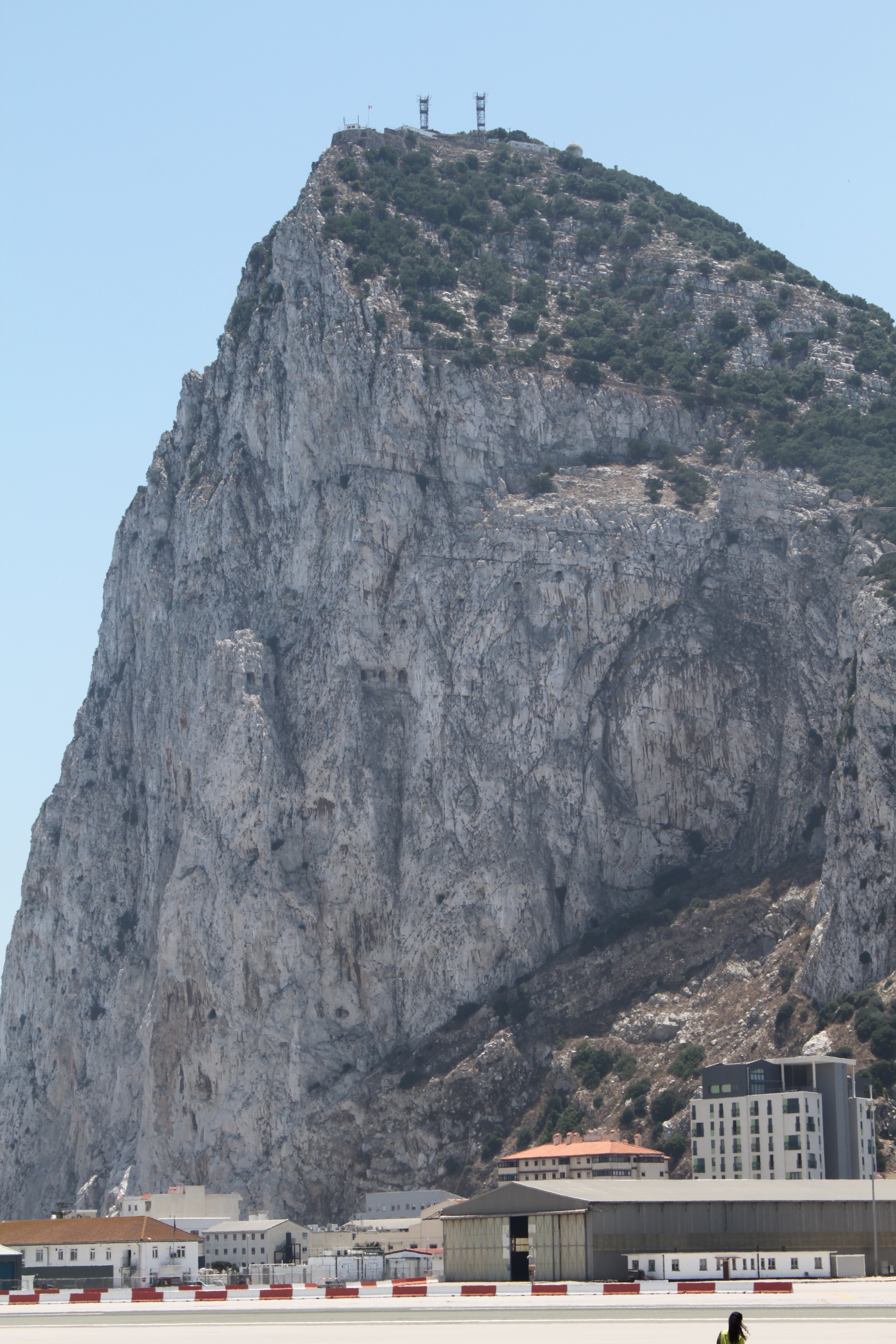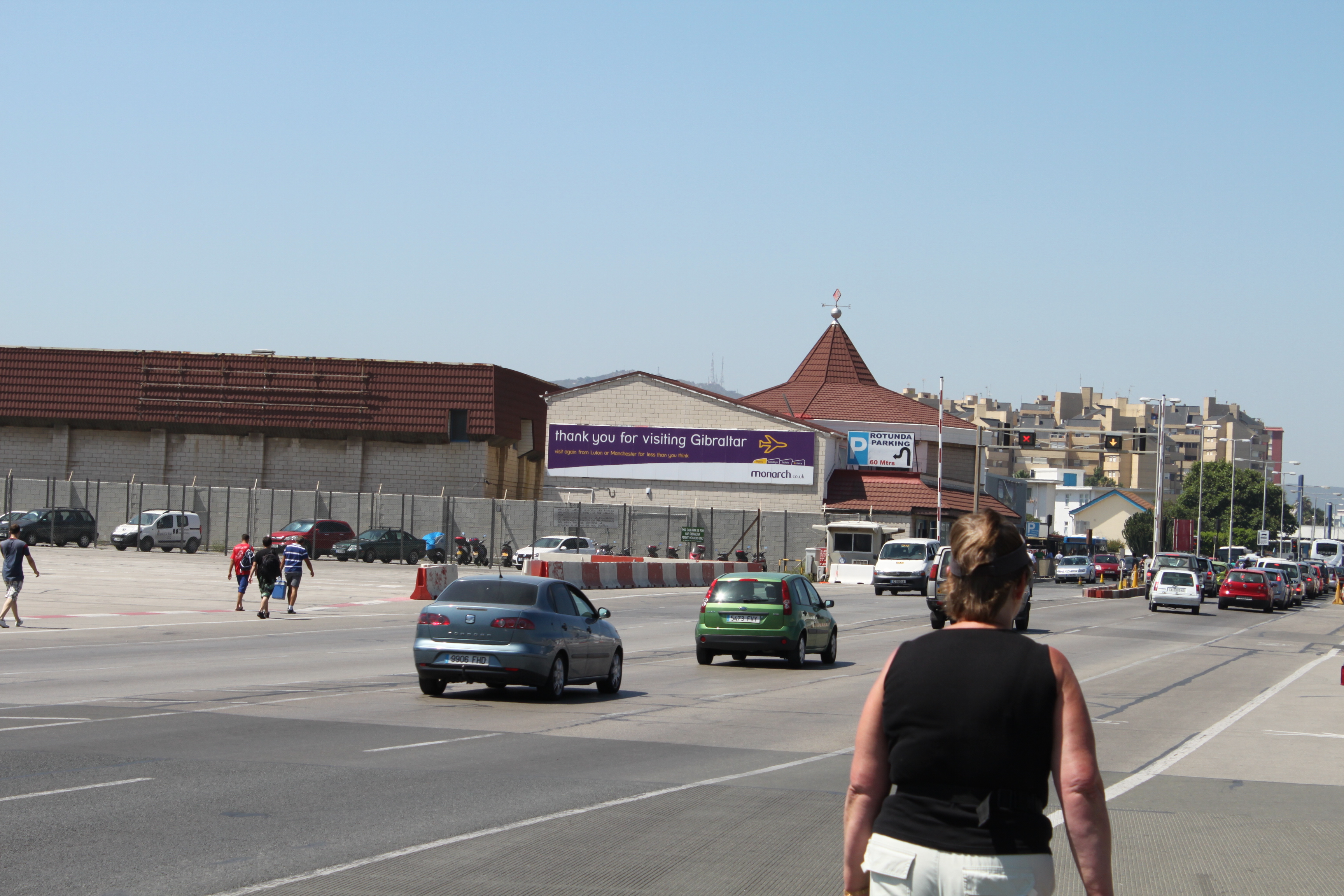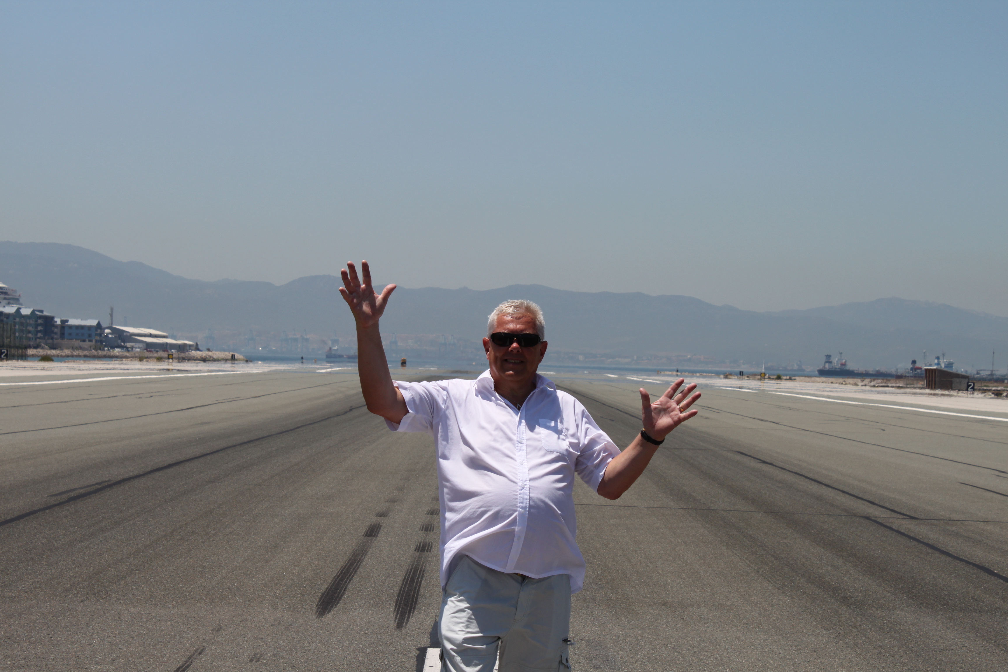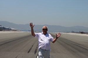 Det första man kommer till efter gränsövergången är flygfältet i Gibraltar. Det går från ”kust till kust”. Här står jag och stoppar planen från landning så alla kan gå över landningsbanan utan risk.