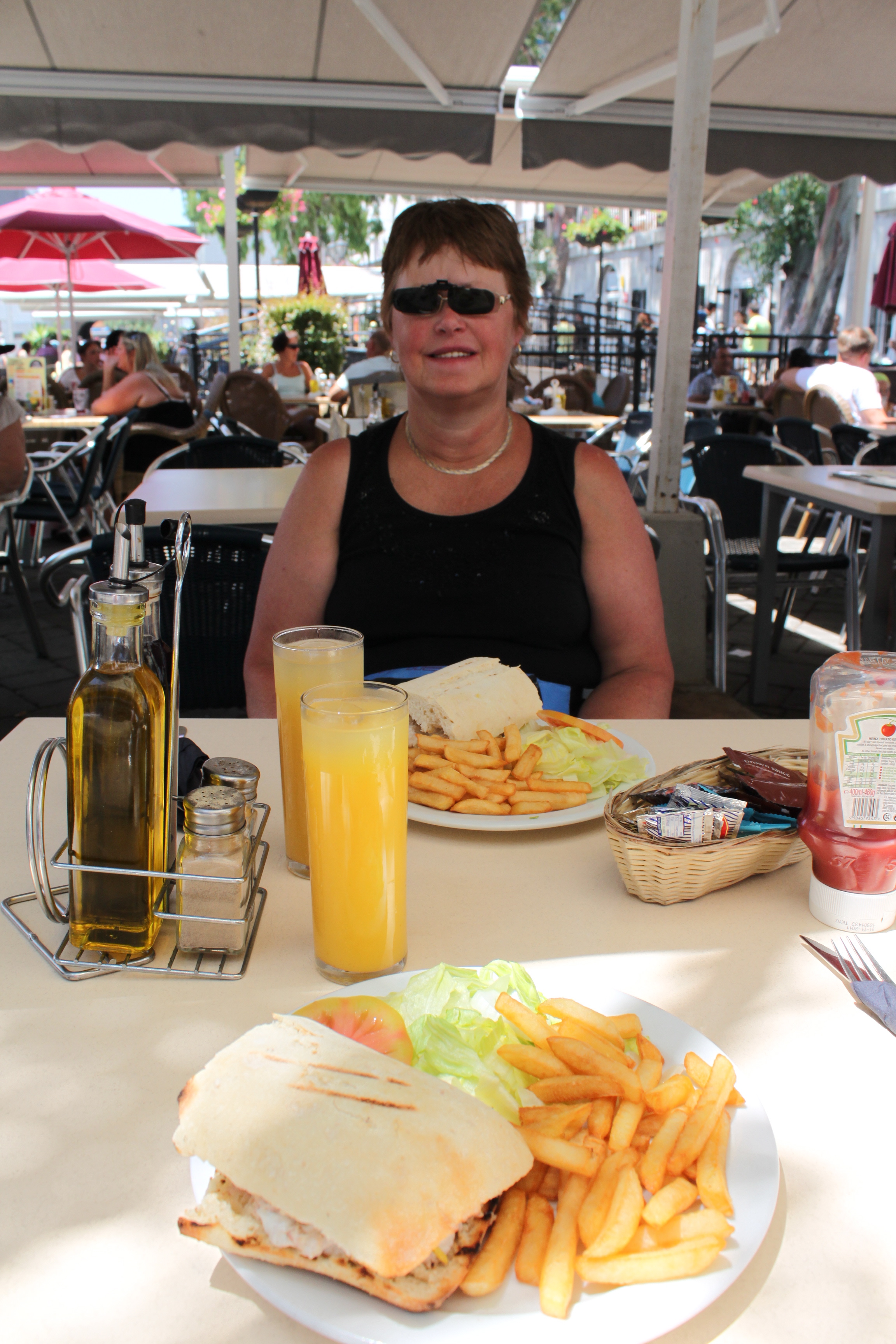 Nu har vi gått i men än tre timmar, det är varmt ute, tänk att få någonting att sitta på, någonting att dricka, något lätt att äta, men vi var mest törstiga. Utan att se matsedeln beställde jag två orange jouice, två pinapple jouice, två koppar kaffe och två sandwish. In kom ett stort rostat ciabata bröd med två cm tonfisksallad emellan, grönsaker och pommes. Tror ni att det smakade gott? Jag berättade för tjejen som serverade oss, om den långa vägen vi gått, hon skrattade, log och vinkade när vi gick från bordet.