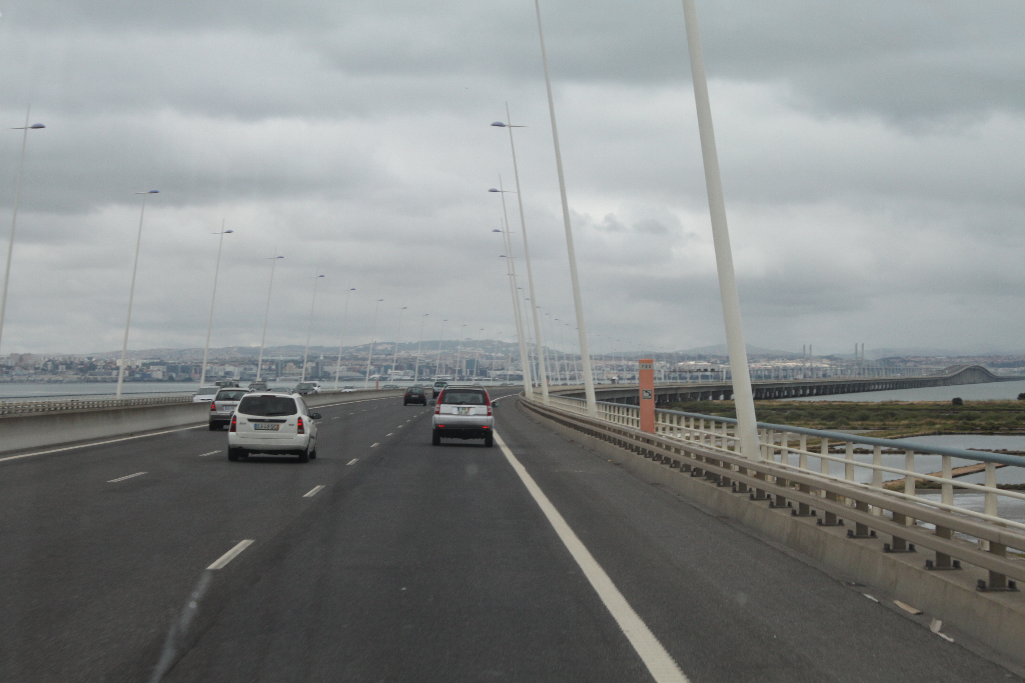 Vi närmar oss tremiljonersstaden Lisboa. Bron över vattnet var milslång kändes det som. Jag är glad över att autopista går utanför centrum.