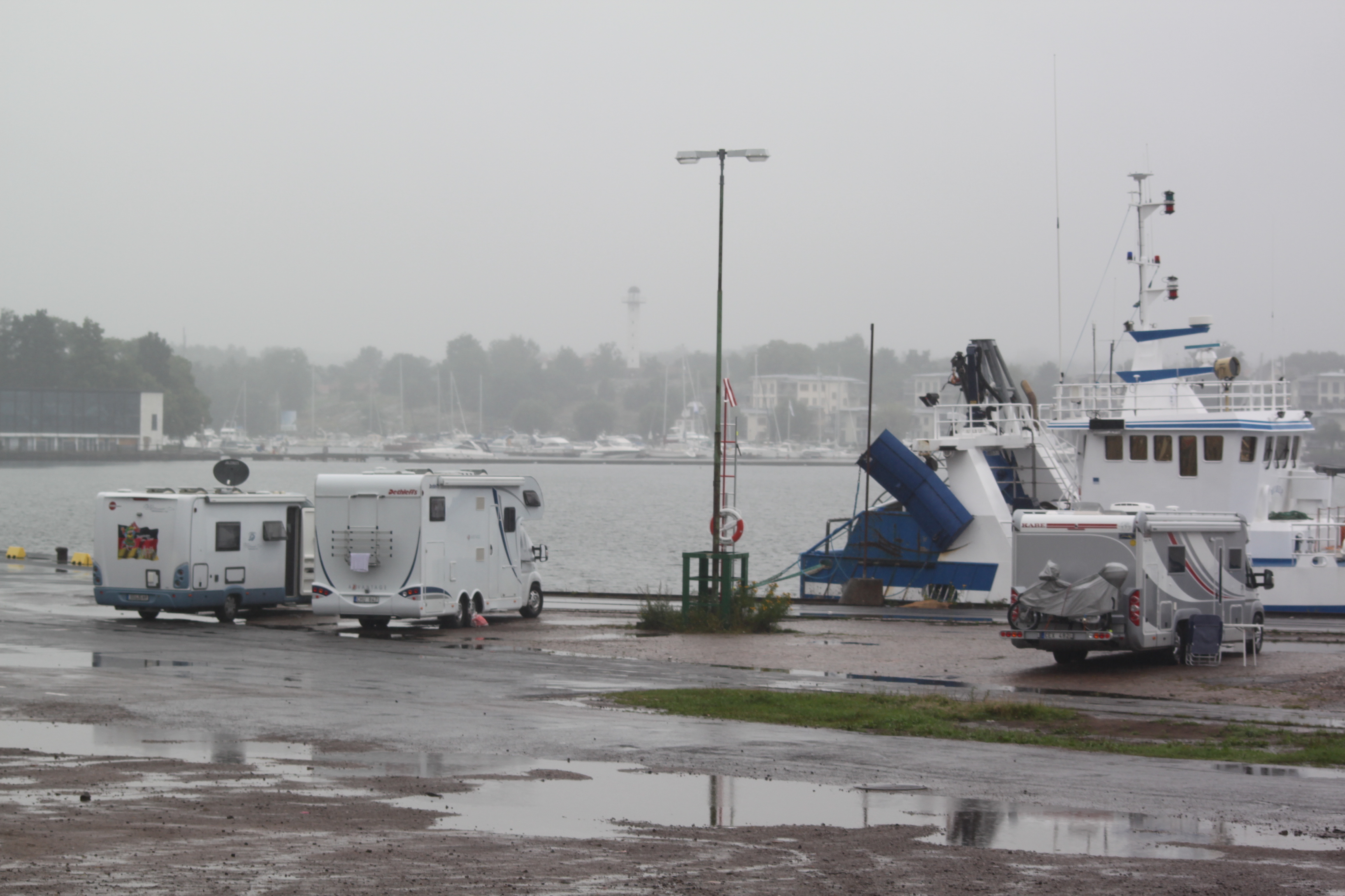 Vi kom hit lite sent fredag kväll, men det var ändå behagligt att sitta ute och vi fick trevliga grannar från Borlänge. På lördagsmorgonen gick det knappt att se skillnad mellan hav och land. Så blött i luften, så blött på land, ja nästan som att ligga i havet.