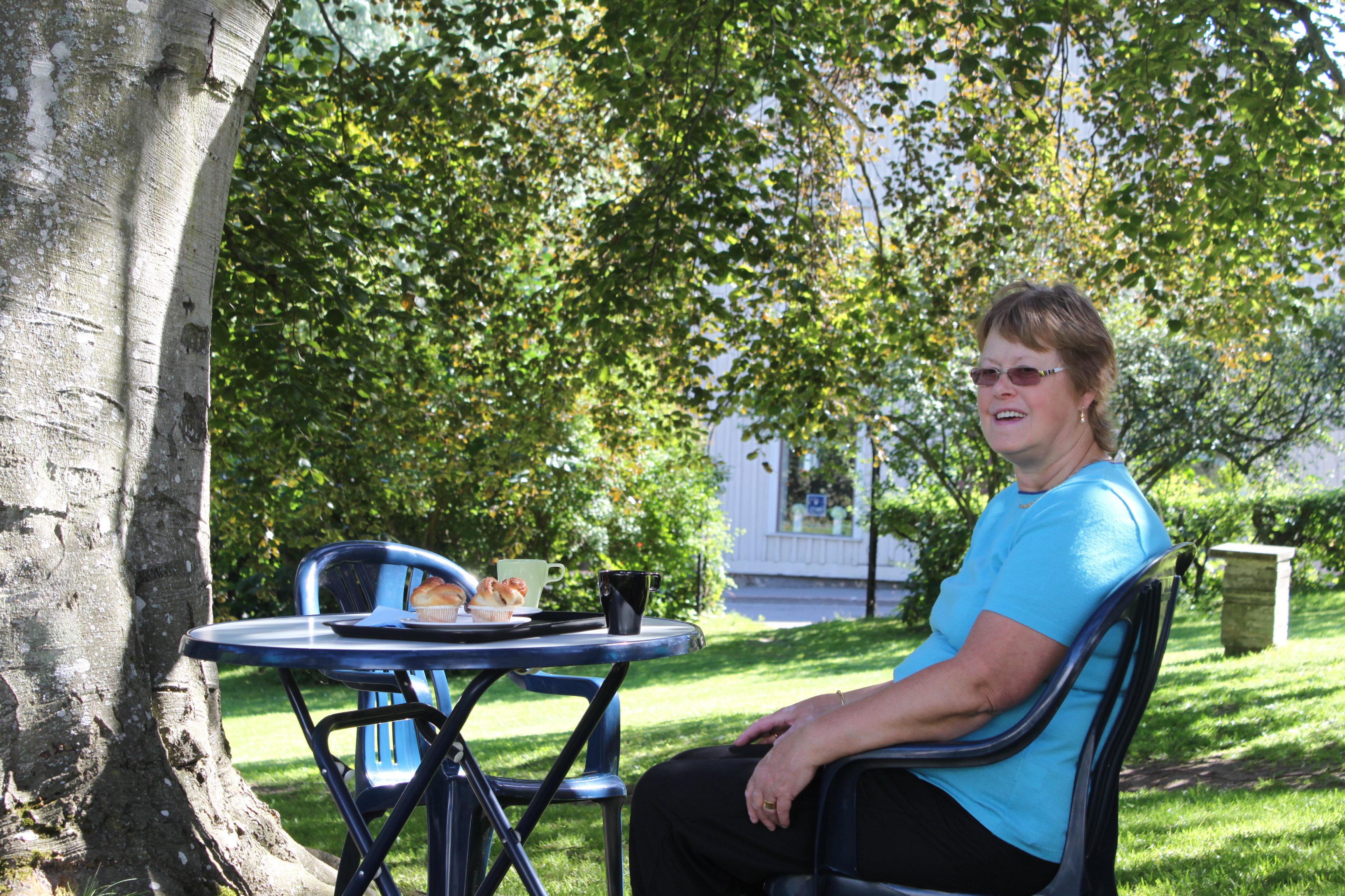 Efter promenaden smakade det bra med fika på vårt stamfik, Nya Hamnbackens Café & Bageri. Där finns en stor trädgård med utplacerade bord att sitta i. Vill man sitta i skuggan och fika, tar man bara med sig bordet till under ett träd.