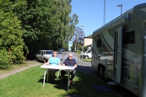 Det var ganska många husbliar i Hjo, kanske beroende på den årliga Spelmansstämman. Vi fick en jättebra parkeringsplats mitt i ”city”. Inte ett ett ljud på hela natten hördes och vi fick en skön vila efter en tuff vecka på jobbet. Vi träffade en trevlig HBK,are bosatt i Hjo. Vi ”sydeuroper” är inte bortskämda med att prata bort en stund med trevliga människor.
