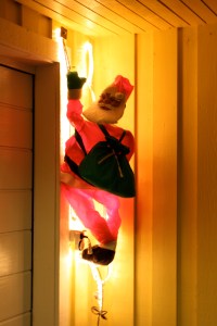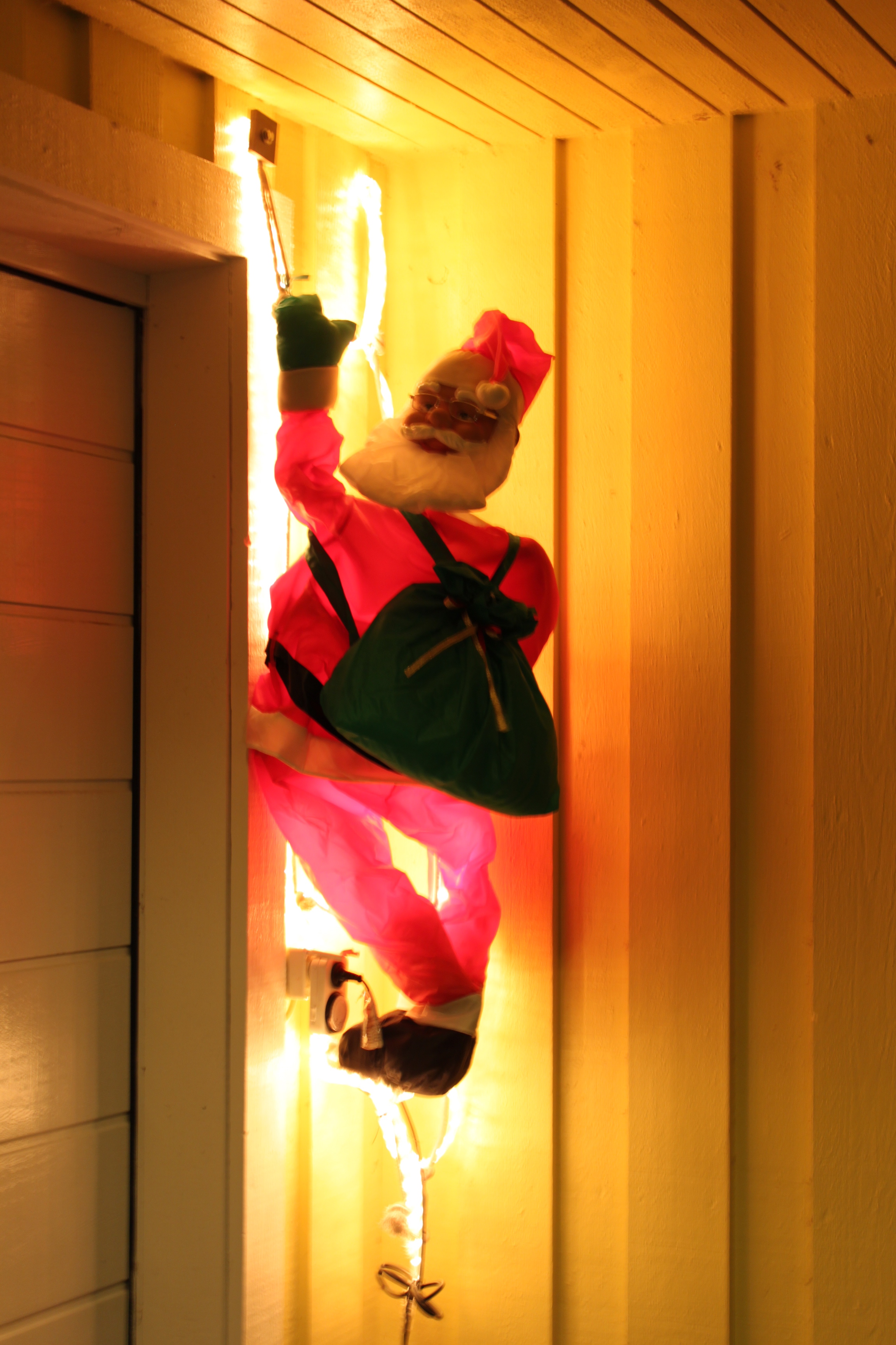 Tur att ingen såg mig när Tomten fastnade i tv antennen tre meter högt över taknocken. Upp med min fyra meters stege på taket i en A formation och upp på högsta toppen. Jag höll mig i det långa metallröret som svajade betänkligt i stormen.