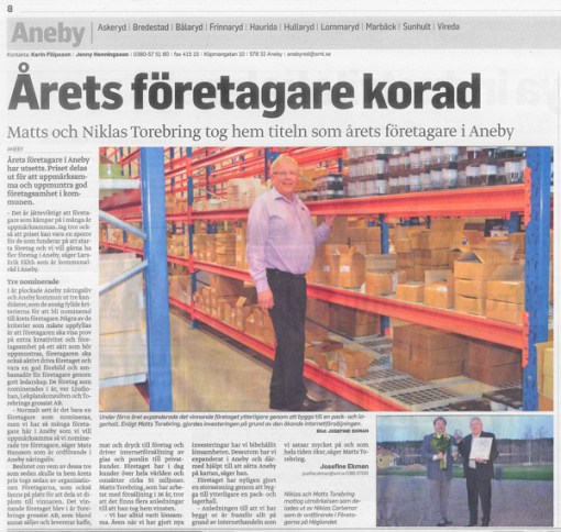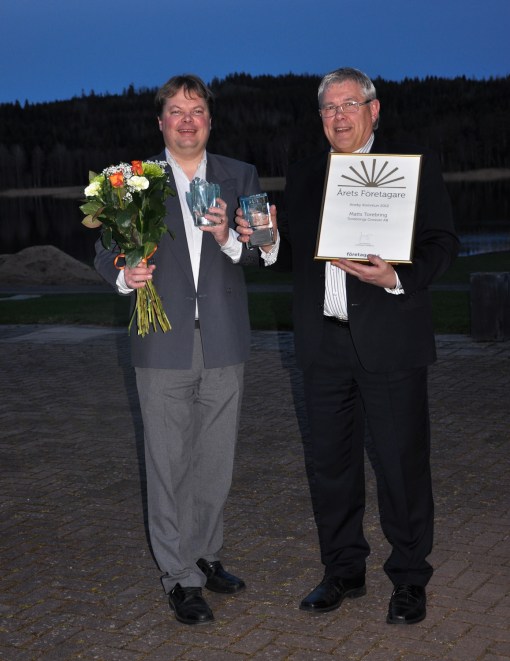 Vi var tre företag som nominerats till priset. Vi hade årsmöte i Näringslivsföreningen, vi åt en god middag på Wiredaholms Golfrestaurang, vi drack kaffe, men bara en enda person från Företagarna, visste vem som skulle få priset. Spänningen var olidlig, och så fick jag ta emot priset tillsammans med min son och delägare Niklas Torebring.