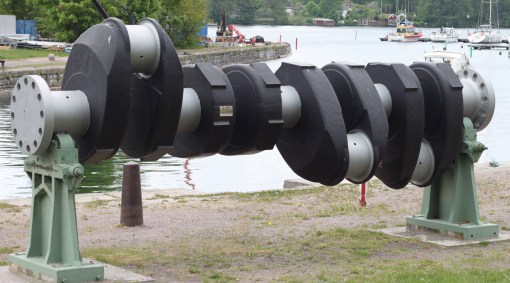 En vevaxel uppmonterad i hamnen, till en dieselmotor tillverkad på Motala Verkstad.