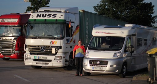 Vi sover med förkärlek bredvid de stora pojkarna, ”King of the road”.  På kvällarna fylls parkeringsplatser, Rasthouse och vägrenar i värsta fall, med långtradare. Hur sent vi än kommer brukar jag alltid hitta en plats att tränga in mig på, som här till exempel. Nu har vi bara en dags beräknad körning kvar, de sista 105 milen till slutmålet i Spanien.