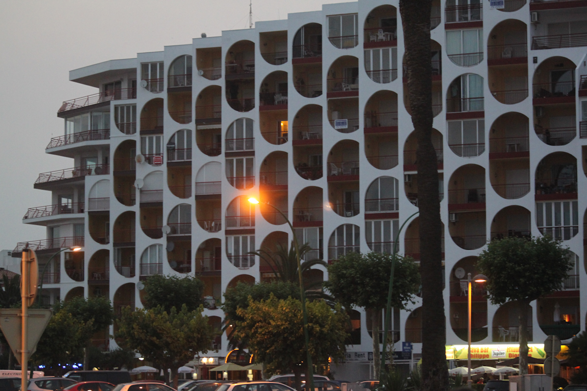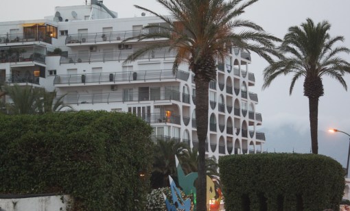 Osäker på om det är ett hotell eller bara lägenheter. Två lika hus med denna arkitektur mötte oss. På långt håll har de formen av ett jättestort skepp.
