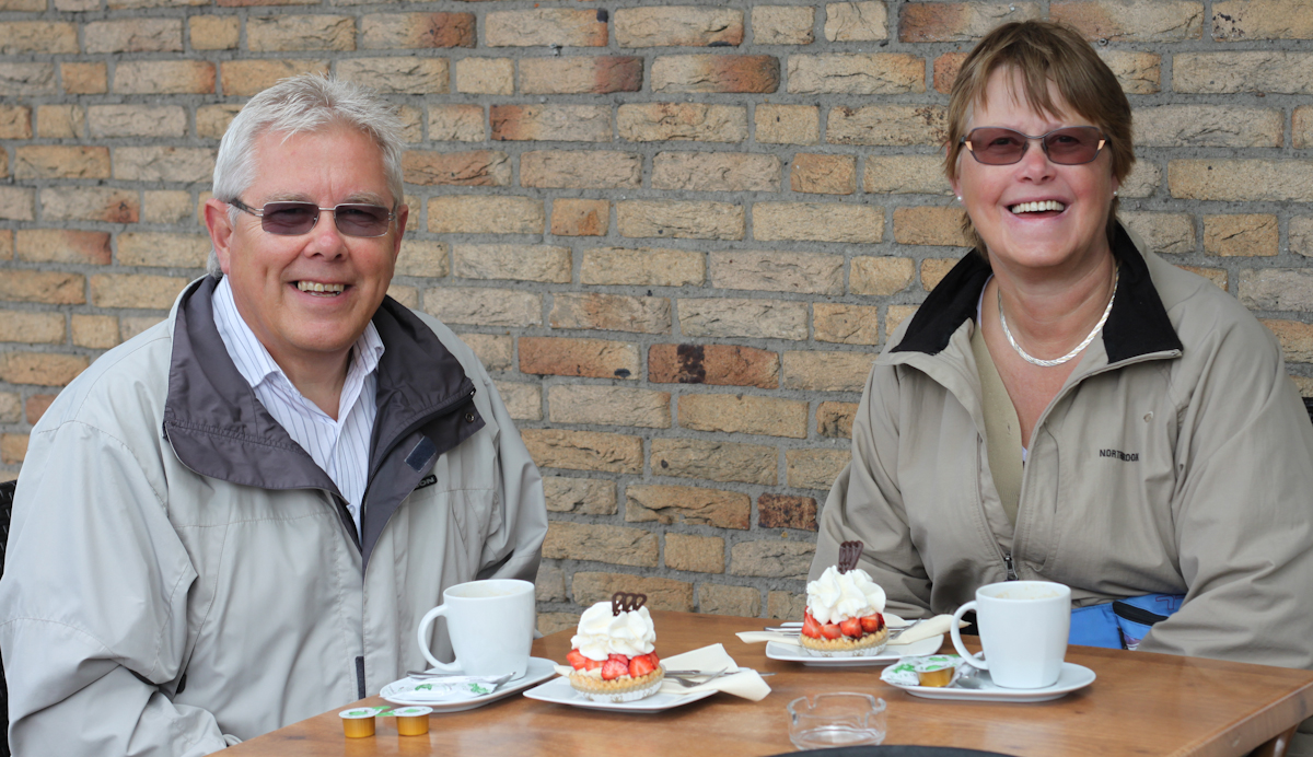 En supertrevlig konditor serverade oss. Det första han frågade var: ”If you want extra with whipped cream”? ”Yes I like vhipped creme”, svarade jag. Så söta, så goda jordbubbar på en festlig wienerdeg i botten och gott kaffe till, dessutom tog han foto och frågade ut oss om vår resa. Vad jättetrevligt. Vår måg sa i sitt tal på sin bröllopsdag: ”När inte familjen Torebring har något att göra, då fikar de”. Javisst är det så, det stämmer till 100 %.