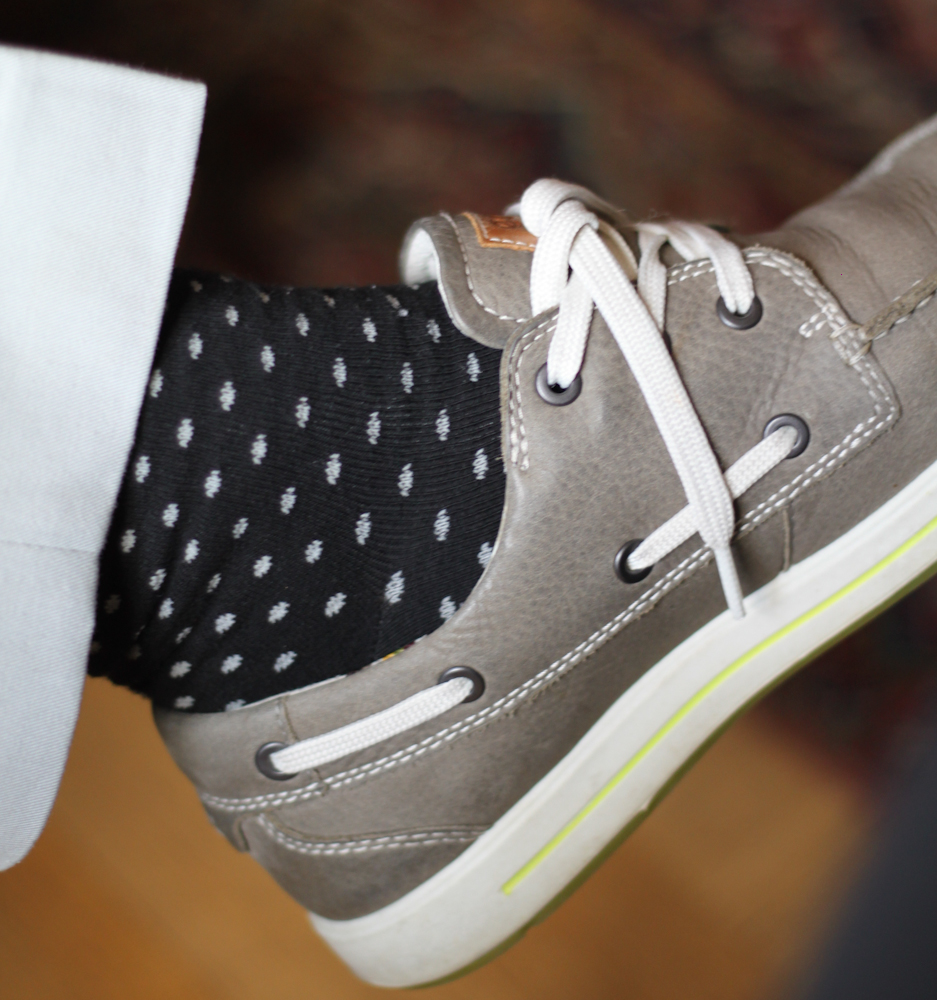 Niklas visade stolt upp sina julklappsstrumpor från Mikael. Vi har ju numera lämnat traditionen med att ge varandra häftiga kalsingar, sa Niklas i sitt tal till jubilaren.