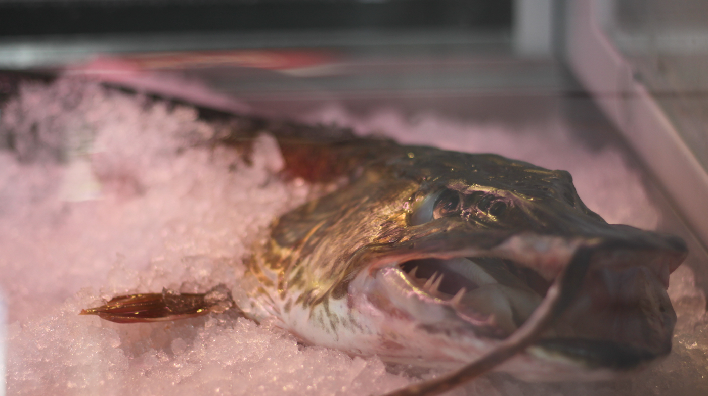 Det första som mötte oss i Fiskeboa, var detta stora rovdjur, en gammelgädda, drygt en meter lång. Jag frågade aldrig på vikten. Jag hade läst på nätet om priset på nykokta kräftor och sett priser på 500:- per kg. Vi köpte 14 stycken för de var inte så stora och till priset av 340:- per kg.