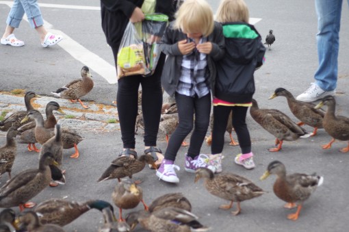 De här små barnen höll på att bli kullslagna av änderna när de såg att det fanns hela påsar med bröd. Barnen sparkade sig fria när änderna blev alltför aggresiva.