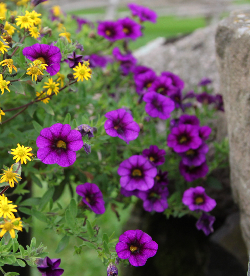 När vi går fram emot sevärdheterna, går vi förbi några blommor i en stenmur.