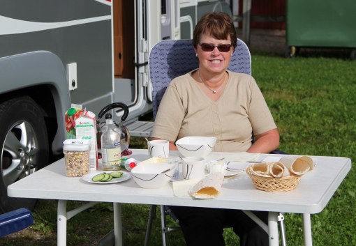 Ska vi äta frukost ute? Hörde jag Bigitta säga innifrån duschen i bobilen.