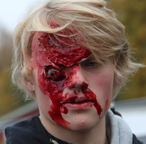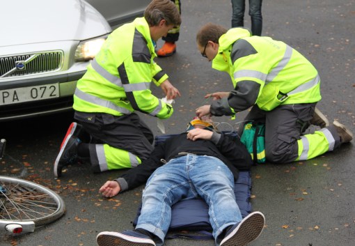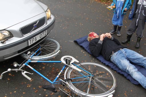 Här har arrangerats en olycka och flera personer är skadade och andra svårt chockade. Hur gör du själv när du ser en skadad, törs du gripa in, eller går du bara förbi? Detta är en tänkvärd frågeställning.
