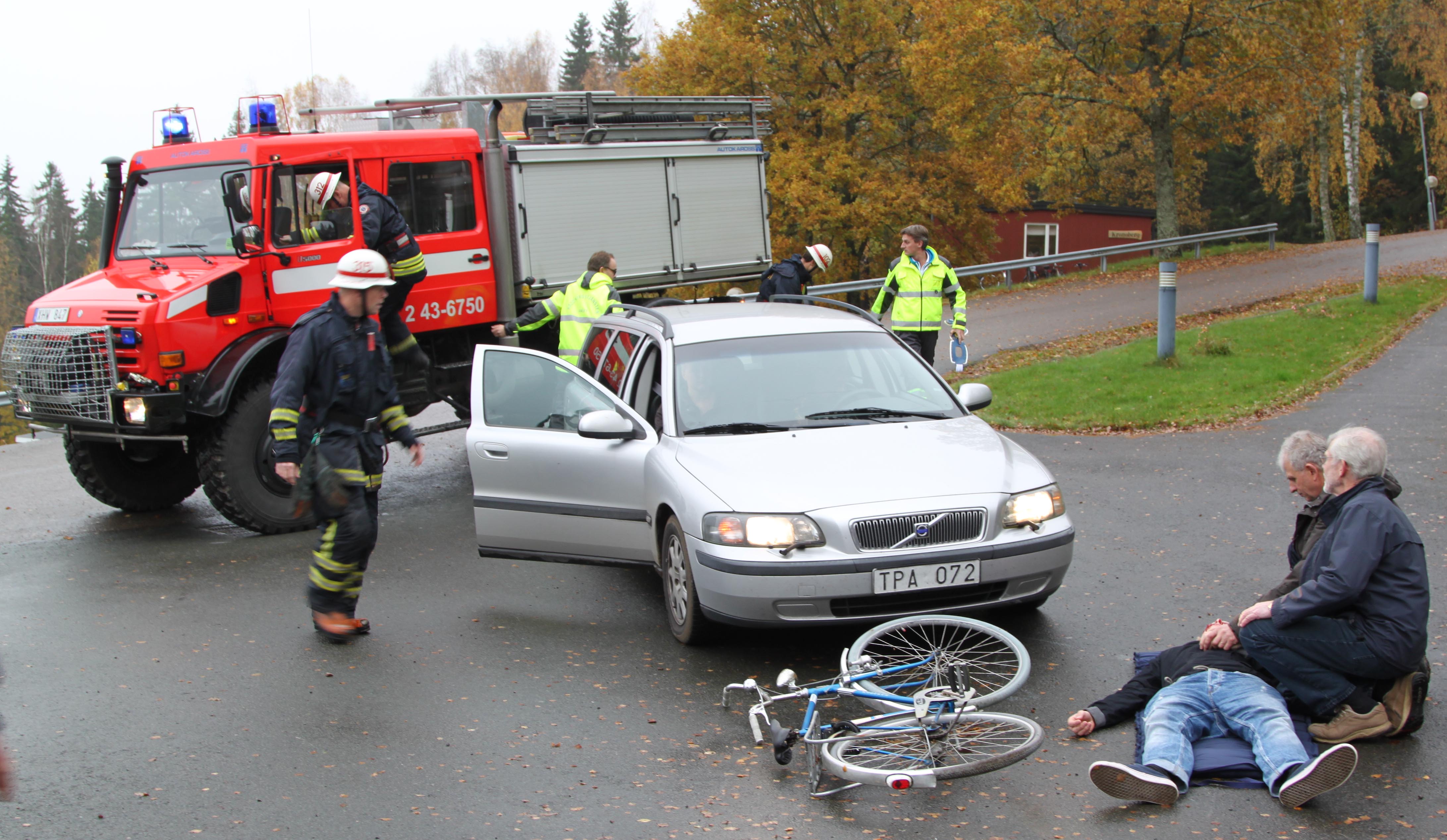 Trots att det var en Volvo som krockat med en cyklist, fick föraren hjälpas ut ur bilen av våra brandmän.