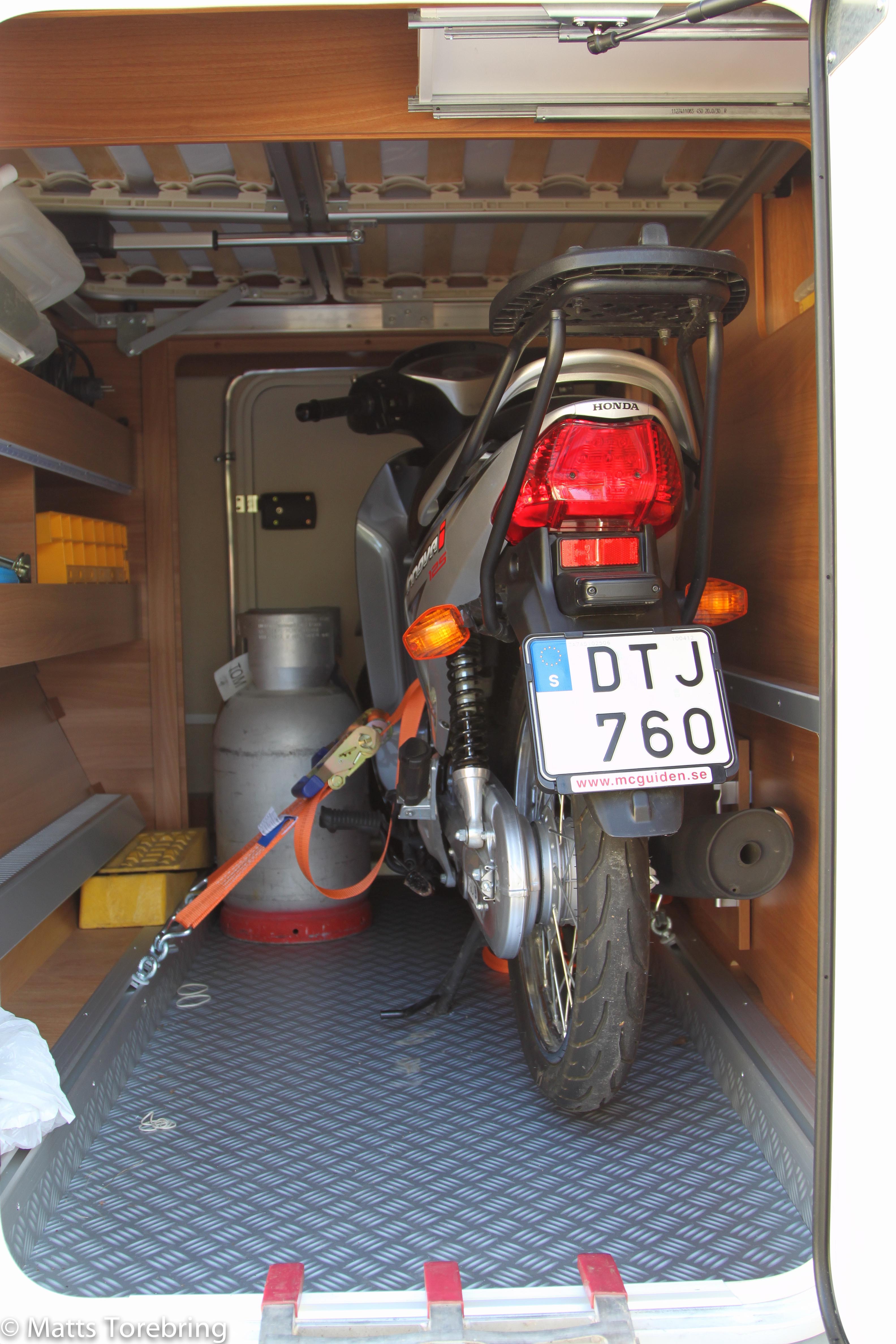 För två och en halv månad sedan, när vi fick hem vår nya fina bobil, Kabe 910 QB, tänkte jag direkt att testa, om Hondan fick plats i garaget. Första tiden var det för kallt att vara ute, sedan kom vårbruket i trädgården. Men i kväll rullade jag in den utan minsta problem. Jag trodde faktiskt inte att den skulle rulla in så lätt och smidigt, som den gjorde. Jag har ju naturligtvis kontrollmätt innan jag köpte bilen, men ändå var jag osäker. Kanske skall jag köpa till en skena i mitten så hjulen alltid står helt på plats. Just nu går det inte att rubba den, så förankrad är den. Jag har en kund i Tranås som har våg och väger lastbilar, hoppas jag hinner in och väga bilen, innan de stänger i morgon. Vår förra Kabe 880 lastade 1100 kg, denna lastar bara 450 kg så det kan vara på gränsen, med vikten.