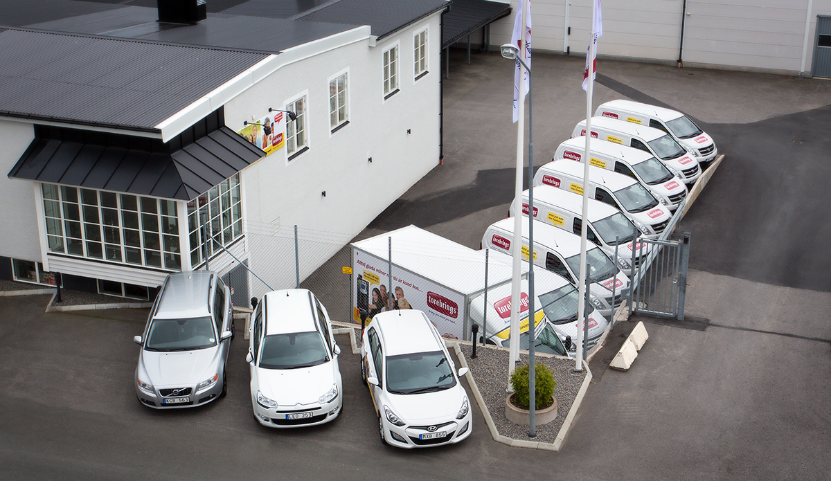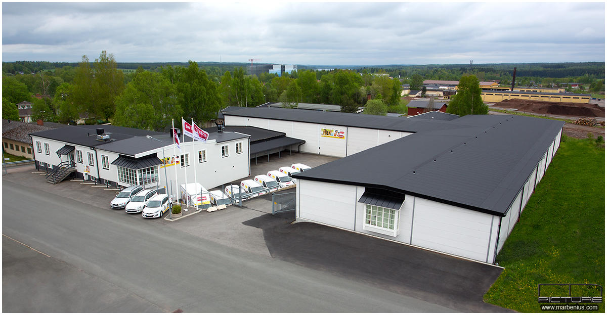 Jag hade ett riktigt pusslande veckan före fredag. Blir det vackert väder, ja en enda stor sol. Då försöker jag få hem alla elva företagsbilarna för foto. Aldrig har vi haft så många bilar tidigare och dessutom sista tillbyggnaden till höger i bild. Ordna en stor skylift och fotograf. När jag tittade på vädret nästa dag var solen borta och det skulle regna 25 mm. Nästa dag igen var det moln. Fredagen kom, alla bilarna kom hem, rena och nytvättade, fotografen kom, skyliften kom, men inget regn kom.