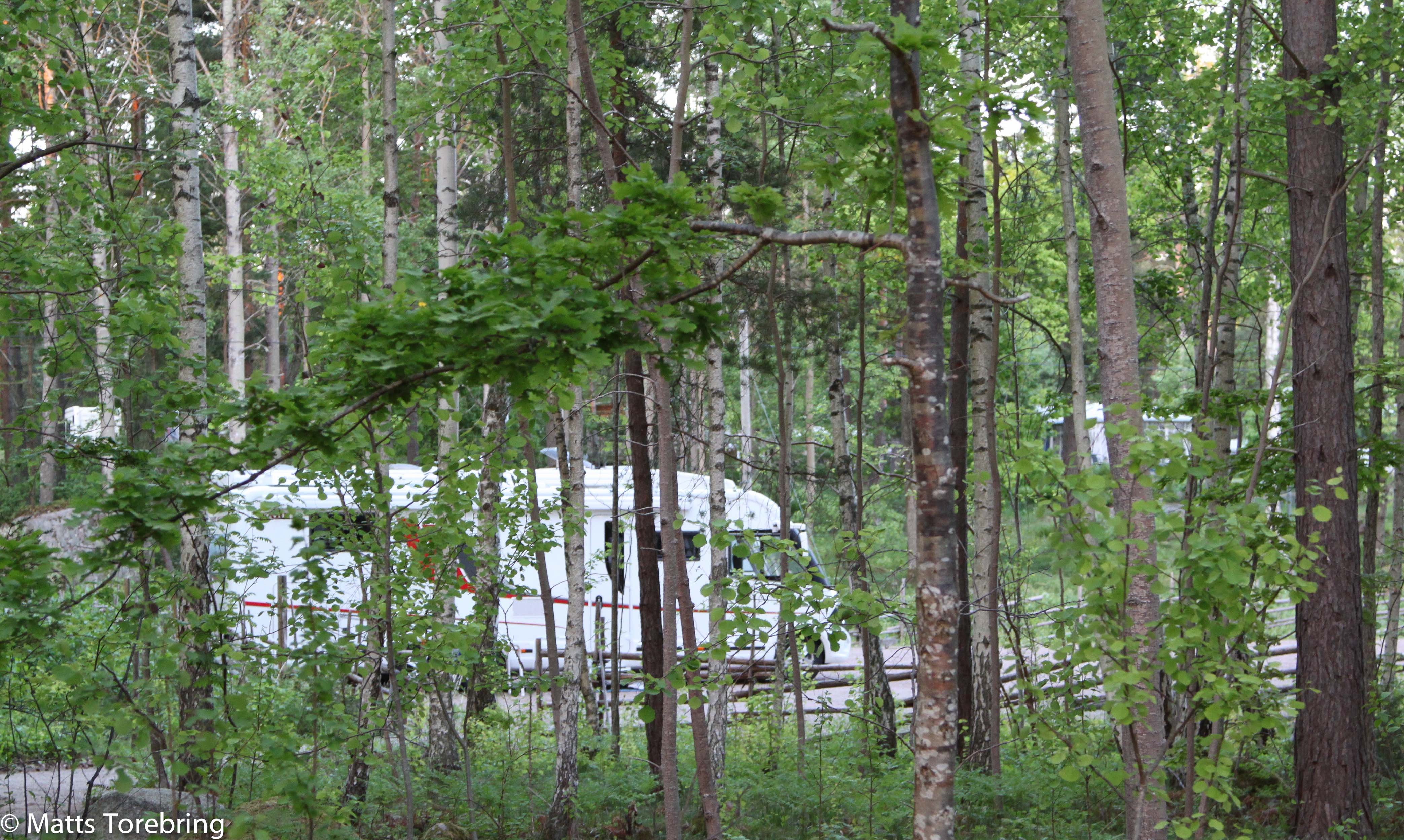 Ställpatsen i all sin enkelhet. En inhägnad grusplan med gärdesgård, nära till vattnet. Servicehus finns ett en stenkast bort inne på campingen. Nog kunde man kostat på sig en färskvattenkran och soptunna nere vid ställplatsen. Härligt att vakna till en fantastisk fågelsång.
