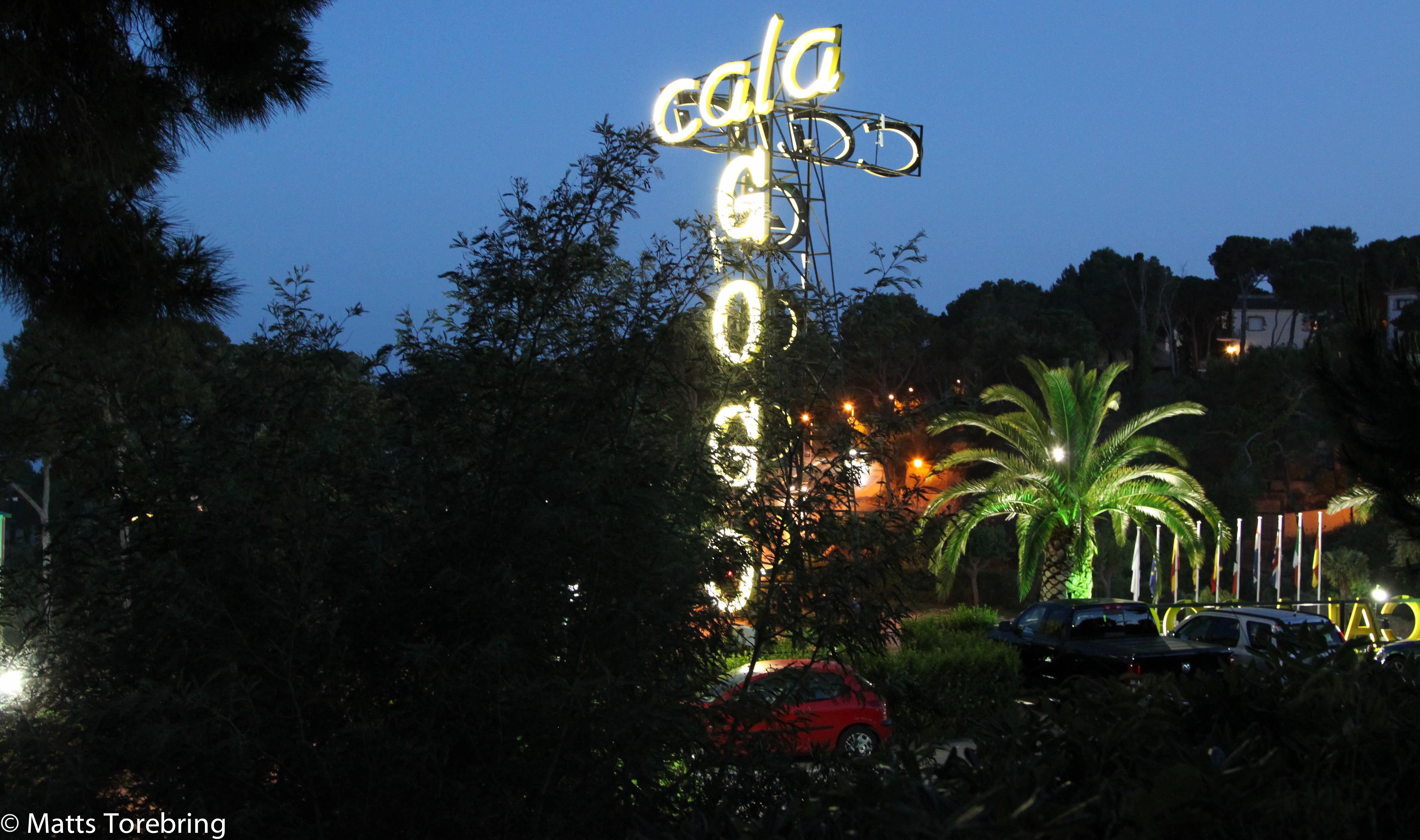 Efter en härlig lördag, har solen lämnat oss. Denna lördagskväll var det lite kyligt ute och vi gick in redan vid 22- tiden. Nu tänds all belysning på Camping Cala Gogo. Så här vackert lyser det när kvällen kommer, sett från vår uteplats där vi sitter.