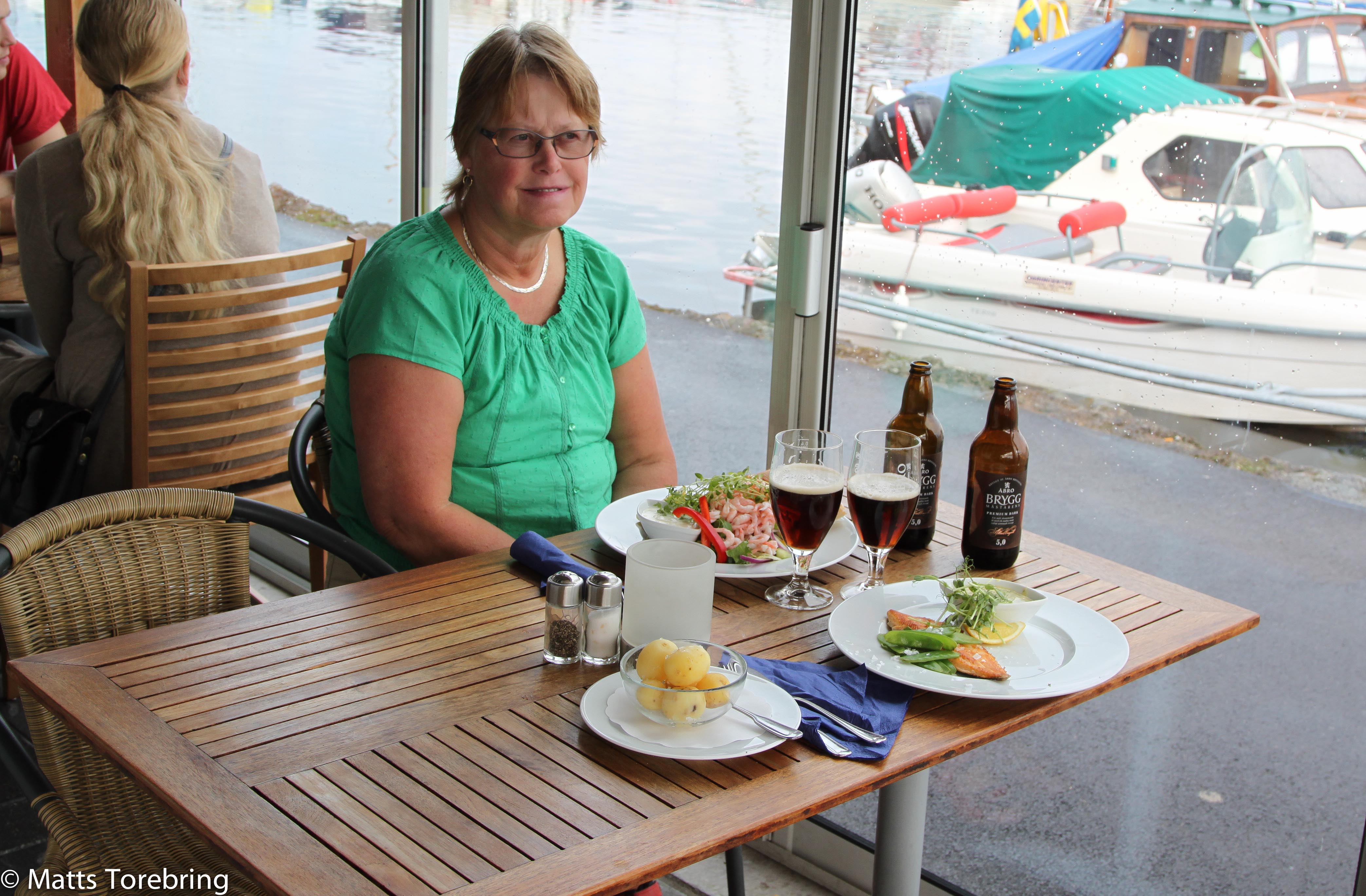 Vi läste recentioner på nätet och sedan gick vi ned till Restaurang Bryggan. Jag åt en riktigt god stekt Röding, medan Birgitta åt en räksallad. Riktigt gott var det och med en mörk lager till dryck.