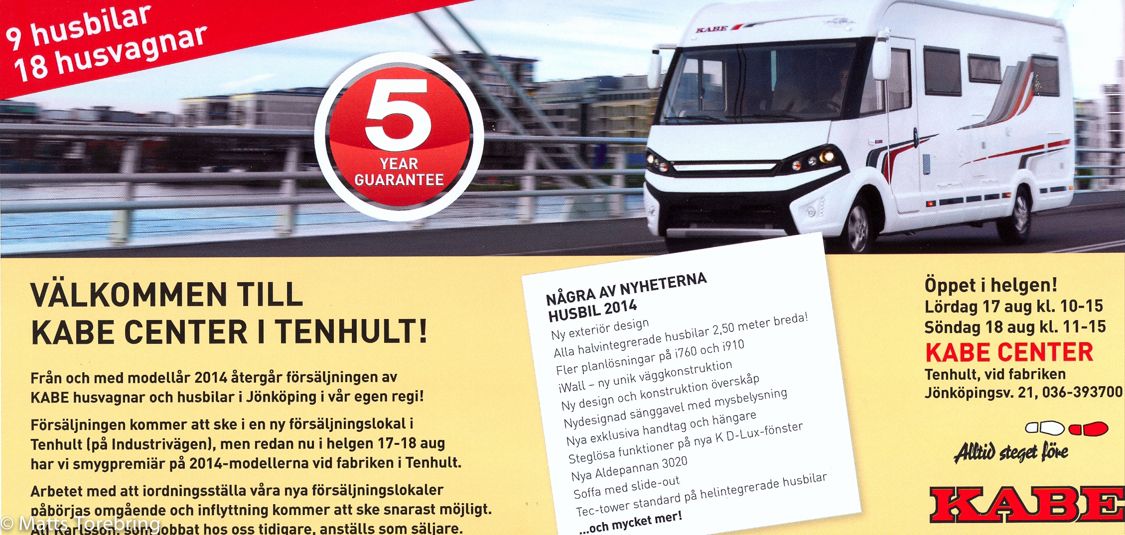 Vi är säkert många, många, många på Småländska Höglandet, som saknade Kabe´s lokala försäljning av husbilar och husvagnar vid fabriken i Tenhult, när den lades ned för tre år sedan. Visst har vi kunnat åka till Öggestorp Caravan som tog över Kabe försäljningen, eller till Östgöta camping i Mantorp och nu senast Bossings i Linköping, men dock inte speciellt roligt. Östgöta Camping har inte kvar Kabe. På grund av satsning på andra märken, blev de utsparkade ur Kabe gemenskapen och Bossings har jag hört bara gott om, men en bra bit att åka till Linköping. Tack för detta framsteg igen Kabe. Som sagt, Kabe är alltid steget före.