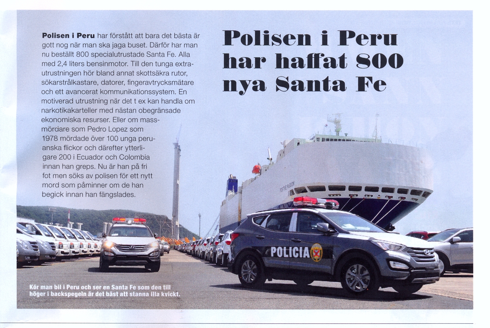 Lite småsurfande hemma i TV soffan, framför brasan, ledde till att jag köpte nio styck Hyundai bilar. Sju styck Hyundai H1 servicebilar, en styck ix 30 säljarbil samt vår egen ix 35.  Dessa levererades för cirka 15 månader sedan. Att nu läsa om polisen i Peru som köpt  800 styck Hyundai gör att min affär känns ganska blygsam.  Mycket mera standardutrustning än i våra tidigare ”franska” servicebilar, ett lägre pris, fem års garanti och vägassistans avgjorde valet. Vardagslyx sa någon av våra anställda.