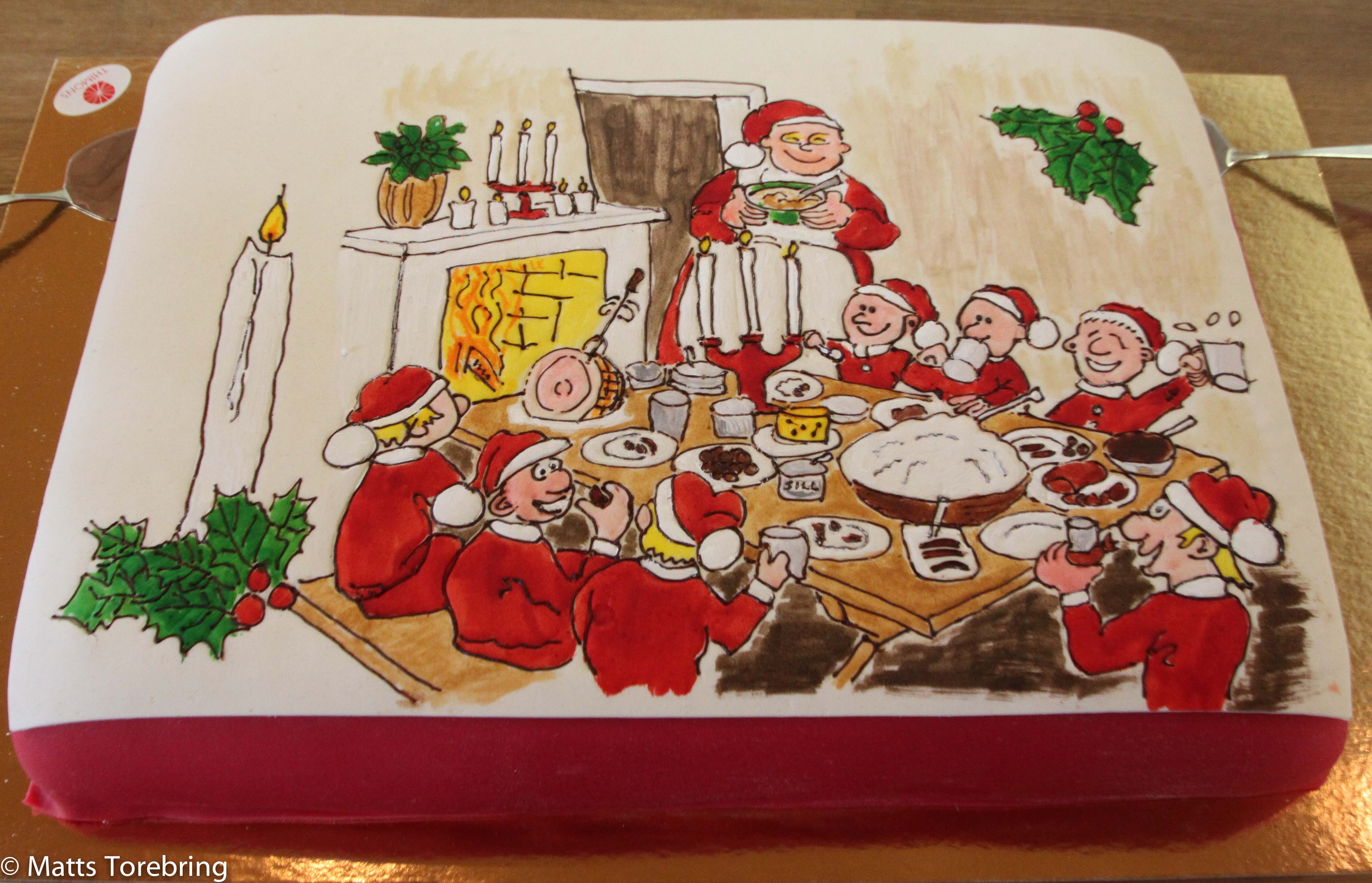 Jag gick in till Thimons Konditori i Aneby och sa, vi har julavslutning på måndag klockan tolv. Kan ni göra en tårta till 36 personer med motiv från en av våra tomtelådor? Visst var jag stum av beundran när jag hämtade den. Jag betalade bara extra för tre timmars extra konstnärligt arbete. Alla mina vänner på jobbet, gick ett varv runt och fotade, innan någon vågade att skåla den. Supergod var den också.