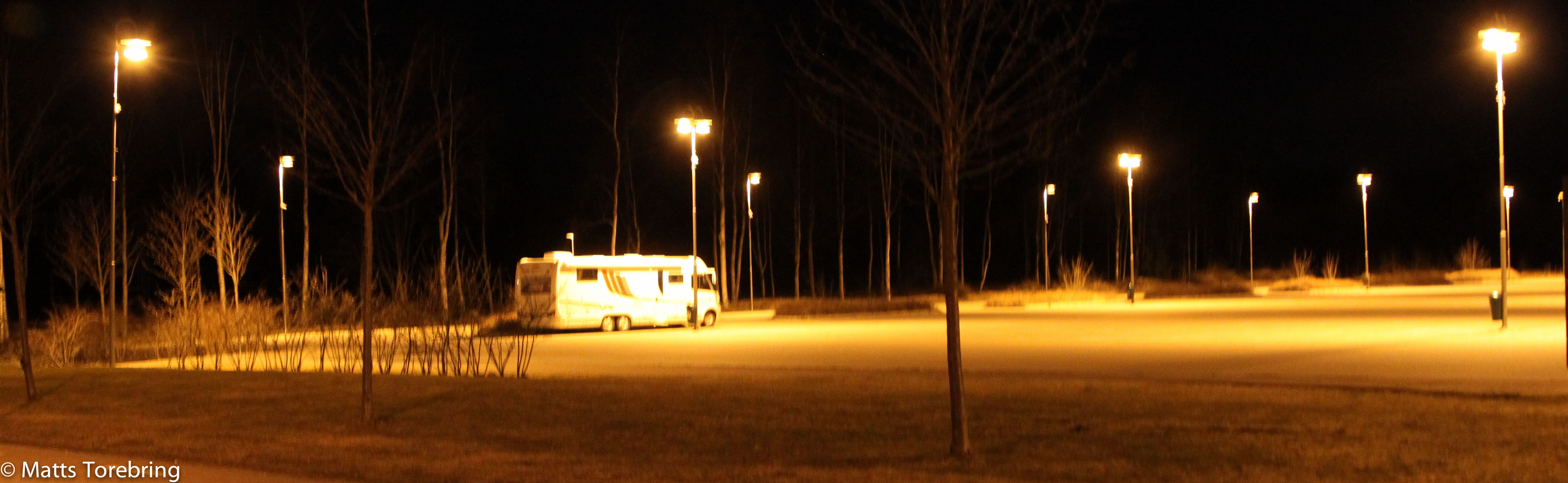 På denna jättestora parkering var det under lördagen max 40- 50 bilar samtidigt. När kvällen kom, var bara vi kvar. Endast tio- talet meter bakom bilen, finns det riktigt bra toaletter. Detta stora varuhus och så lite besökare en lördag som denna, lever det vidare på bara semesterfirare?