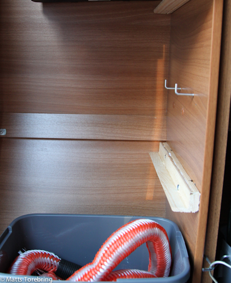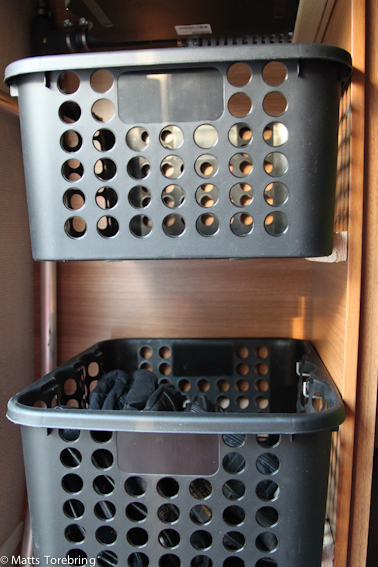 Till vänster i bild de fem upphängda korgarna.Tyngre saker som startkablar, bogserlinor, nivåklossar har jag valt att packa i hinkarna. I bilens standard hyllor har jag elkablar, hylsnyckelsatser, ledverktyg, skruvmejselsortiment, skyddsoveral, motorolja, tvättmedel med mera, med mera.