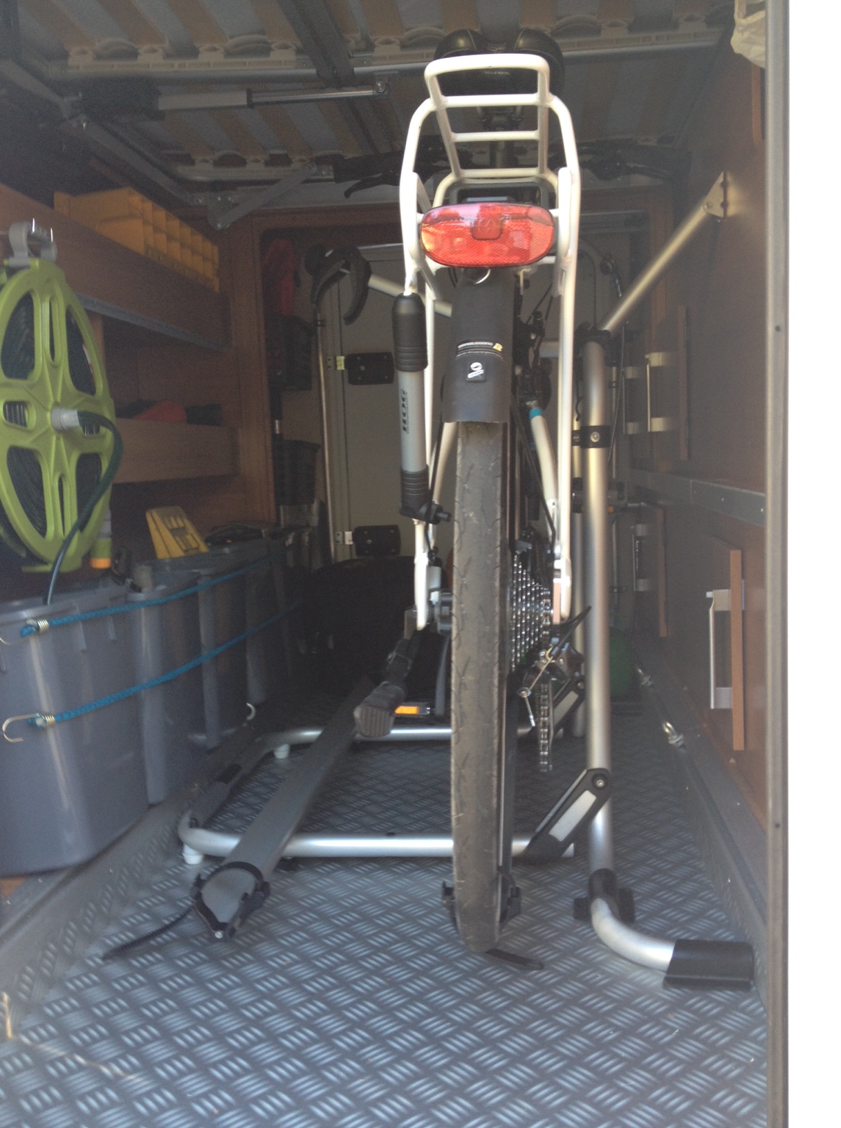 Jag var lite fundersam på hur jag skulle förankra våra nya el-cyklar, när de får vila och åka med oss i husbilen. Jag vill inte ha märken efter spännband på nya fina cyklar. Jag hittade detta snabbt i Kama Fritid´s katalog, för just montering i garage. Otroligt lättlastat och cyklarna står stadigt fast, utan att komma emot varandra. Vill jag ha det uppfällt är det vara att fälla upp det. Dessutom kan jag ha vårt stora trädgårdsbord innanför stället.