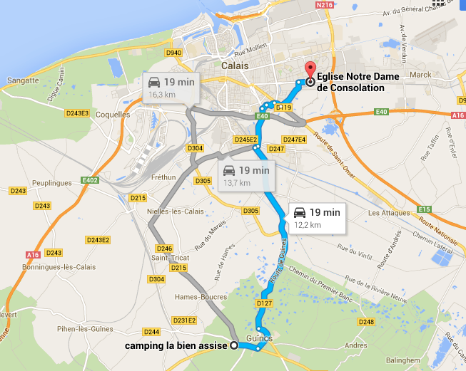 Vi hade med oss en GPS när cyklade i väg. In till Calais var det bara att byta vägnummer fyra gånger och inget konstigt. Lite värre var det när vi kom fram till Calais. Jag visste att kyrkan låg i den norra delen av sta´n. Med en cykel kan man gå på trottoaren en bit, för att lokalisera sig. Efter många korsningar hit och dit kom vi fram.