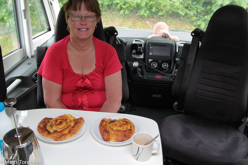 Som tur var, hade jag köpt goda bakverk att festa på. Det krävdes 23 cm stora tallrikar, för att rymma dessa ”wienerbröd med äkta russin i”, som var riktigt supergoda. Efter lunch kunde vi bära ut våra utemöbler i solen, vi satt ute och det var riktigt skönt till 21- tiden på kvällen.