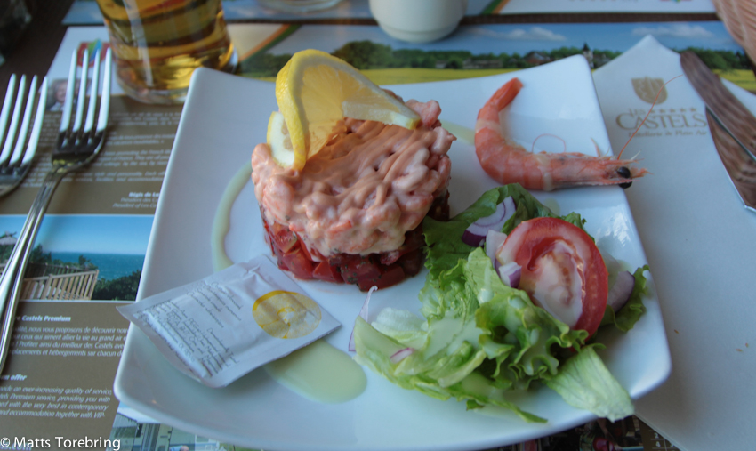 Starter, räkor på inlagda hackade tomater, riktigt gott.