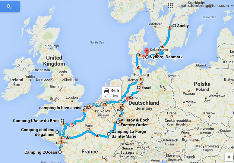 Vi har nu bott på 7 stycken Les Castel Campingar i Frankrike. Två styck har vi besökt tidigare år och det var dessa som lockade oss tillbaka. Totalt finns 46 stycken, alltså har vi 39 campingar kvar att besöka. Jag hoppas att fortsättning följer nästa år… Nästan alla campingarna är fem stjärniga och personalen talar engelska och alla har varit enormt trevliga. Resan i år blev totalt 5150 km. (Km på bilden från Google Maps stämmer inte, då jag inte fick till hemresan fullt ut) Vår Kabe med totalvikt 5500 kg, har dragit 1.13 liter diesel per mil. (enligt egen bokföring)