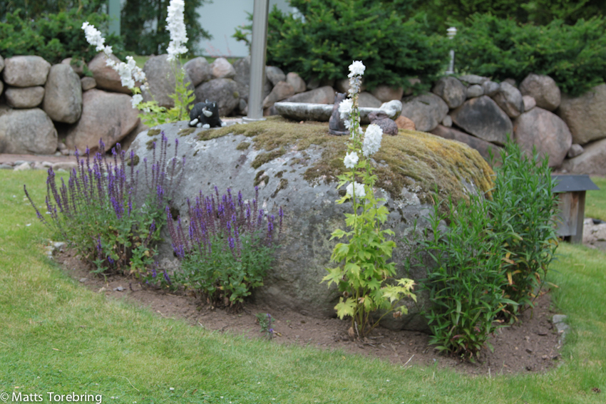 En stor riktigt stor sten, som inte är helt enkelt att plantera runt, då det blir brännande sol mot söder och kallt på norr. All sten som nu ligger synlig, har jag brutit upp på vår tomt.