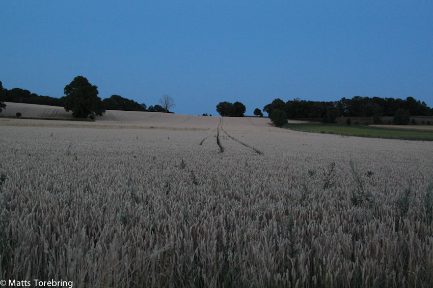 Mörkret faller över vetefältet vid Bergs Slussar.