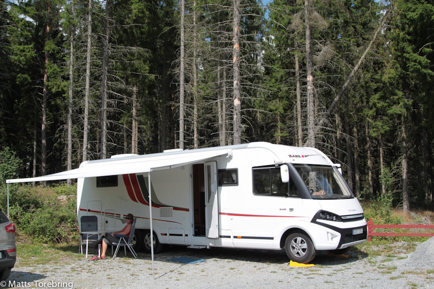 Det är stora skyltar ute vid vägen mellan Vrigstad och Värnamo. Sedan sitter det små skyltar utmed vägen, hela tiden genom skogen, 1200 meter kvar, bara 1100 km kvar med små smilisar och så vidare. Ställplatsen är kanske inte världens bästa, men återigen 100 % tystnad. Det finns riktigt bra toalett och dusch, med en ny handduk för varje besökare. Ställplatsen kostar 100:- exkl. el 50:-
